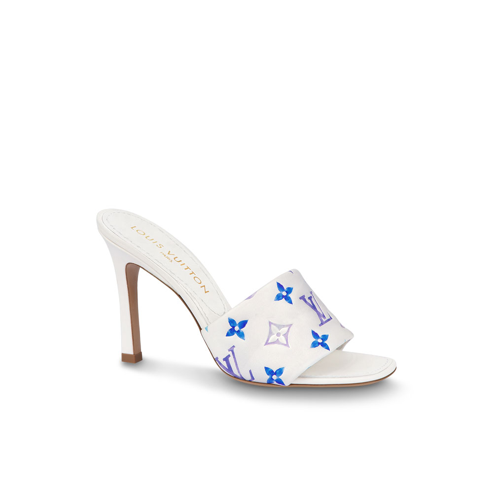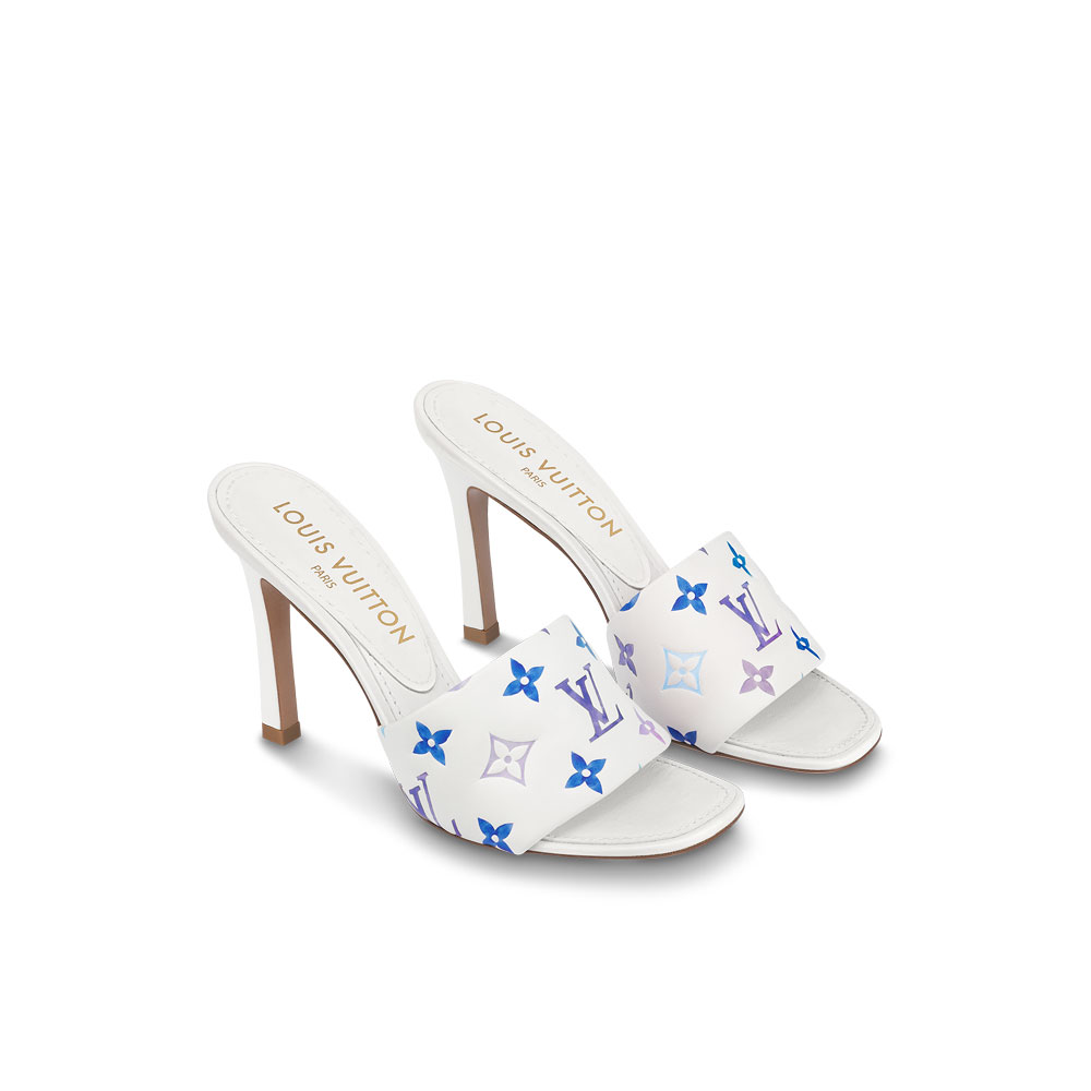 This seasonal edition of the Revival mule is crafted from extremely soft lambskin. Its wide front strap is debossed with the Monogram pattern in a gradation of summery shades coordinating with the leather goods collection. This model is finished with an elegant high heel and a fine leather outsole.