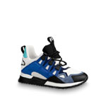 This graphic version of the emblematic Run Away sneaker comes in blue calf leather with flashes of black and white. Louis Vuitton's reinterpretation of a classic running shoe. this sneaker is distinguished by its technical outsole with a hidden footbed for extra height. It features a rubber LV signature at the back.