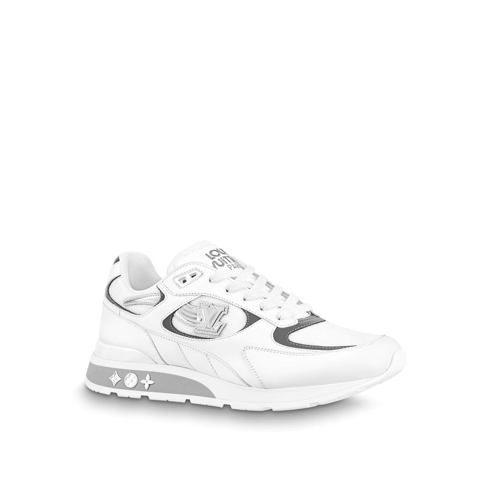 This monochrome version of Louis Vuitton's iconic Run Away sneaker combines calf leather with Monogram mesh. This reinterpretation of a classic running shoe is characterized by its technical outsole in lightweight micro. which is decorated with Monogram Flowers. The distinctive LV Initials signature on the side was first seen at the Fall-Winter 2020 show.