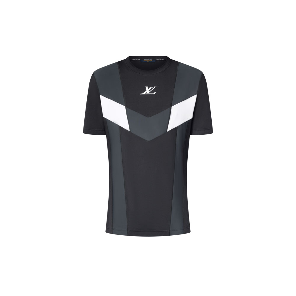 This black running T-shirt combines fashion with functionality. It is constructed from fast-drying, soft and breathable technical fabric with a 4-way stretch for comfort. Sporty gray and white inserts create a flattering color-blocked look, adorned with a reflective LV on the chest. A matching track top and shorts make a coordinated set.