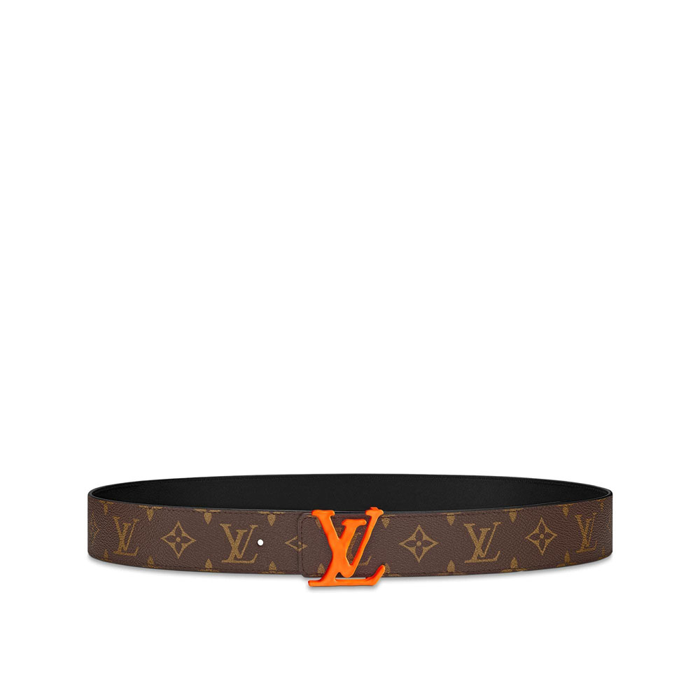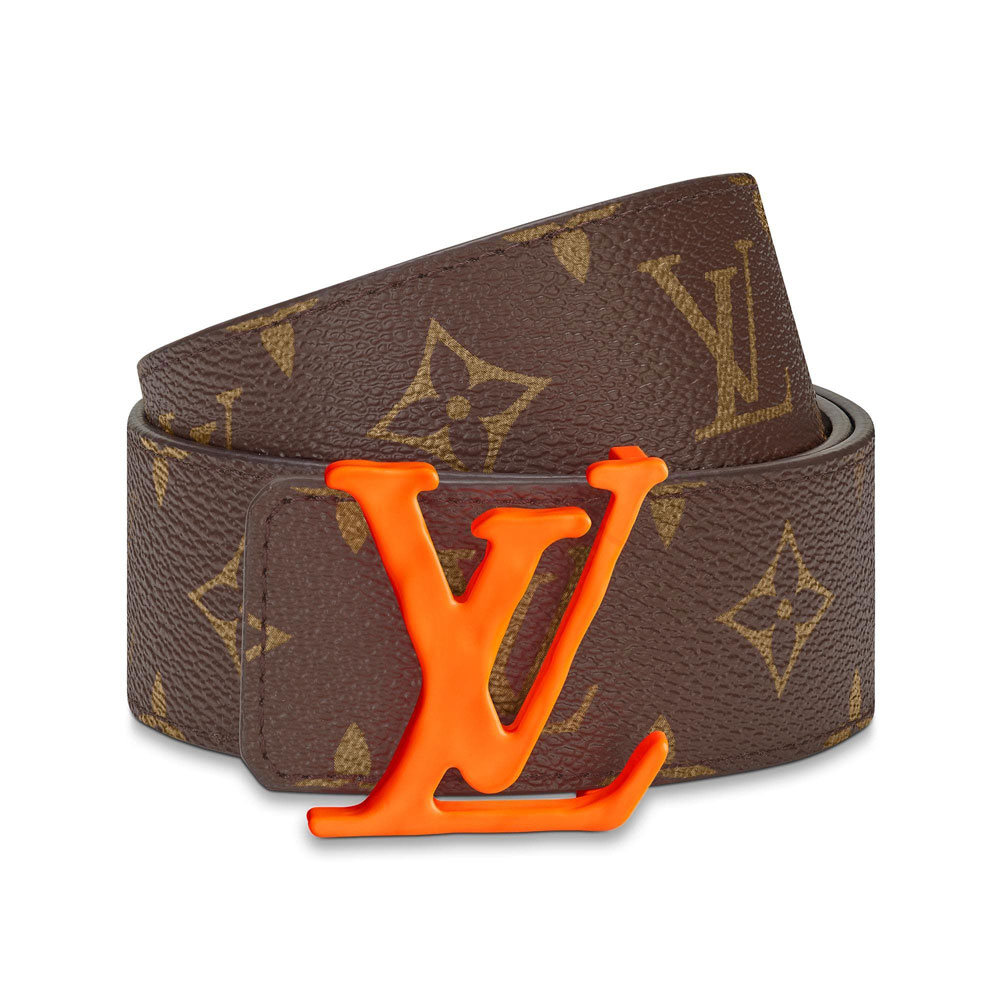 Exuding Creative Director Virgil Abloh's signature design aesthetic. the LV Shape 40mm belt is a simple yet bold twist on an iconic design. Classic Monogram canvas and the LV Initials centerpiece reflect the House's illustrious heritage. whilst the vivid matt orange of the buckle lends a playful touch. This piece pairs perfectly with the Spring-Summer 2019 Leather Goods collection.