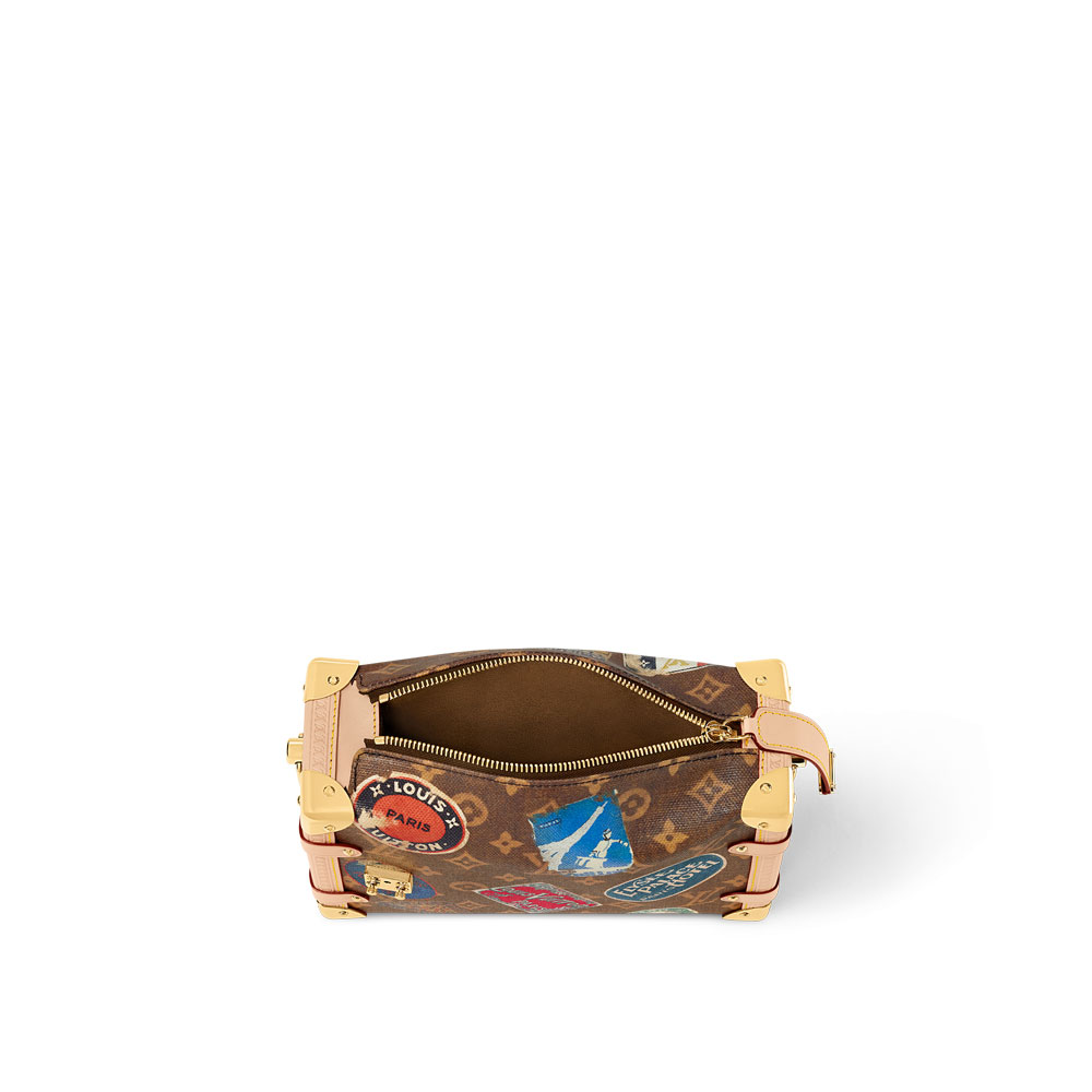 From the Spring-Summer 2024 show comes this Side Trunk MM handbag. It is inspired by the Maisons archive-trunk Monogram canvas, made of a blend of cotton and linen glazed with resin for a superbly soft hand. Decorated with hotel labels that pay tribute to Gaston-Louis Vuittons fabulous collection, the bag is trimmed in heritage natural cowhide-leather. Both handle and strap are removable.