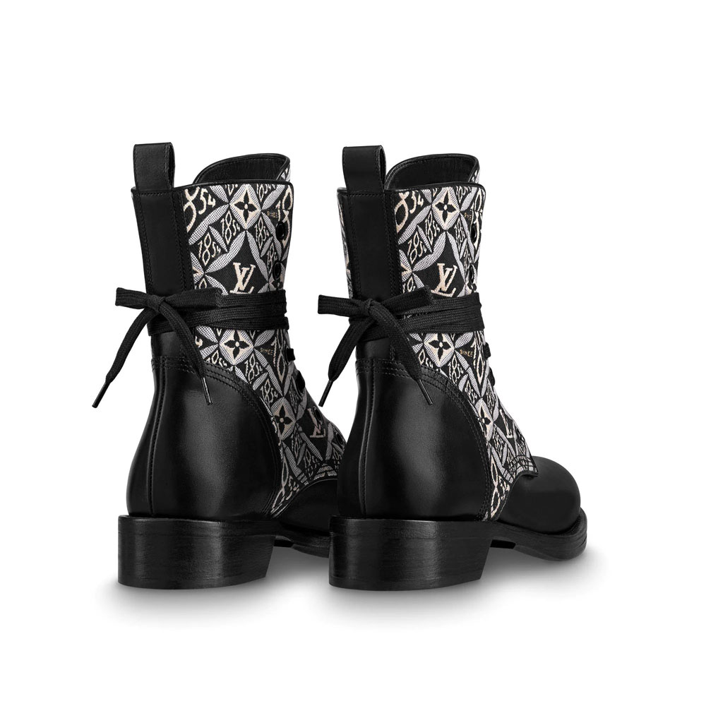 This version of the Metropolis flat ranger is part of the Since 1854 collection of accessories. leather goods and ready-to-wear. This fashionable combat boot combines black calf leather with jacquard textile featuring a vintage-look canvas created by Louis Vuitton Artistic Director Nicolas Ghesquiere. The name Since 1854 references the date the House was founded.