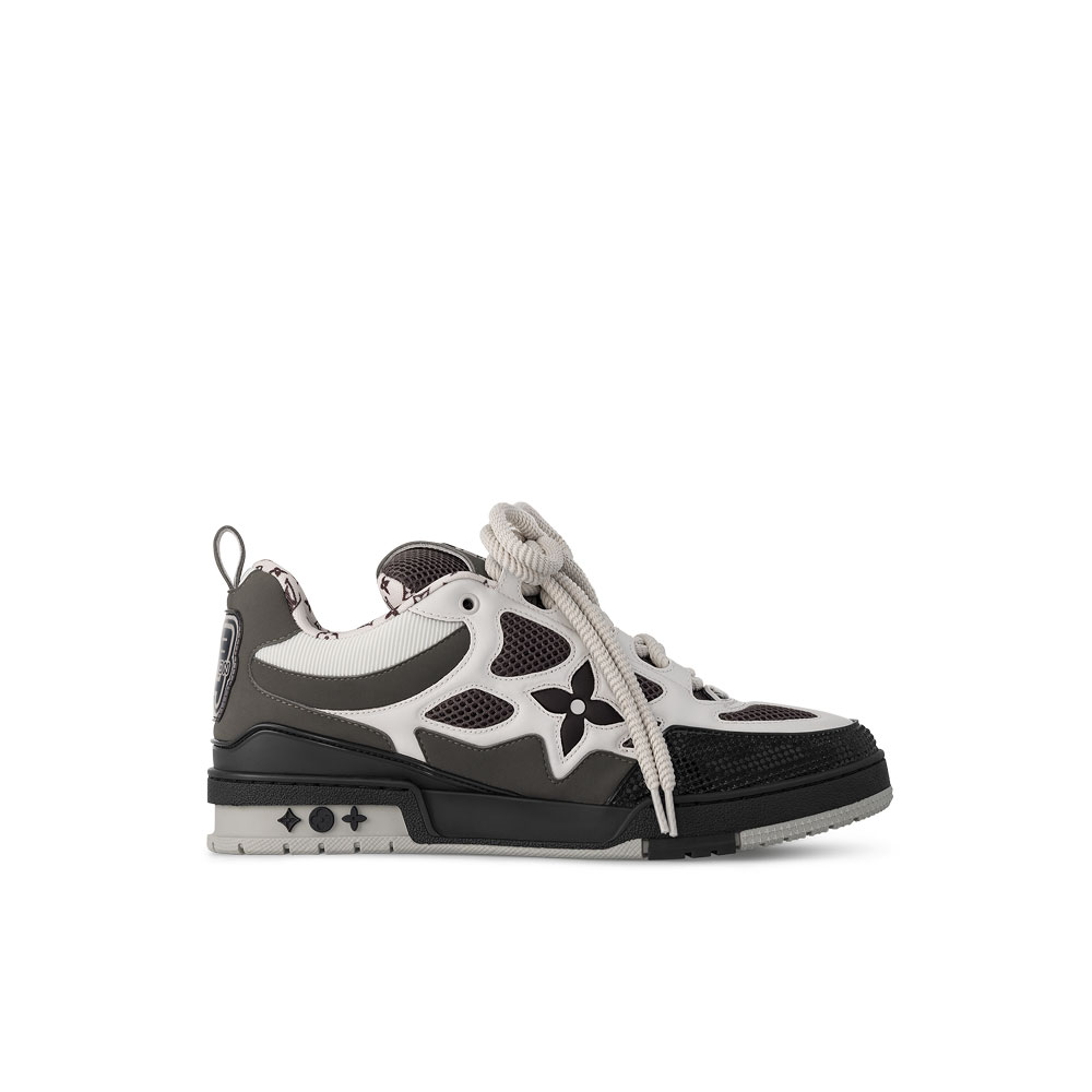 The LV Skate sneaker is revisited this season in a mix of materials. Including technical mesh. The design references Nineties skate shoes and features a technical lining with a Monogram print and extreme padding for optimum comfort. This bicolor model incorporates a Monogram Flower on the side and three Monogram Flowers on the outsole.