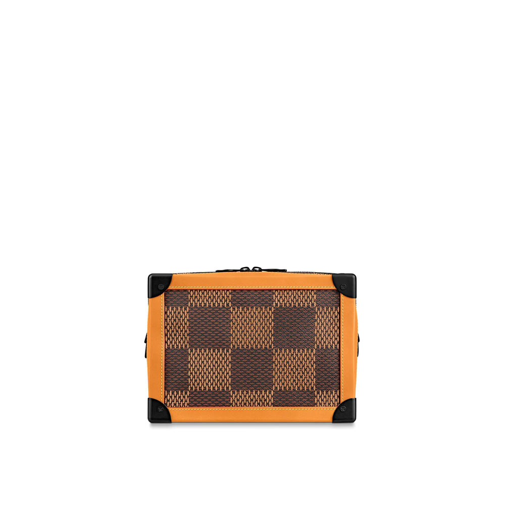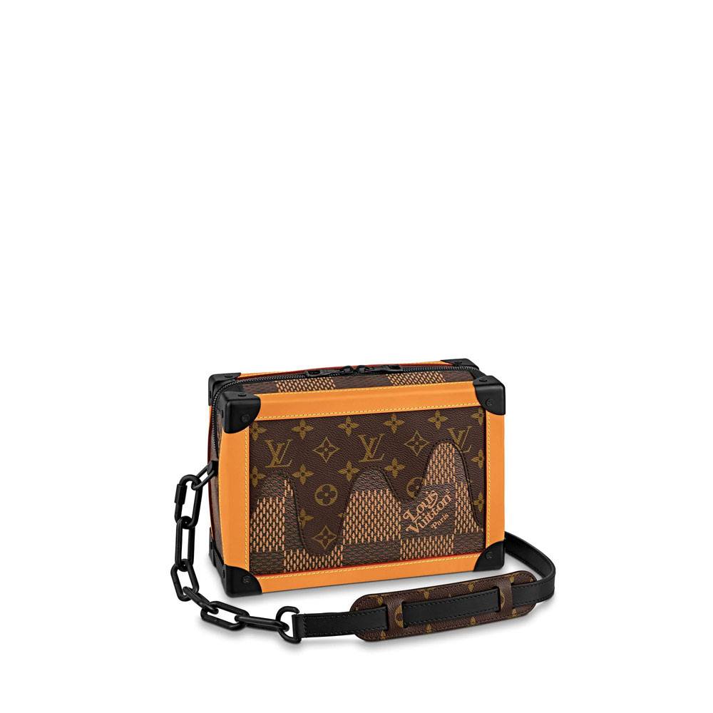 Virgil Abloh and Japanese streetwear designer Nigo have come together to refresh the Soft Trunk messenger bag in Giant Damier Ebene canvas and natural leather. The Soft Trunk's leather corners. padlock and S-lock make reference the House's trunk making roots while the drippy wave motif in Monogram canvas on the front evokes Nigo's streetwear work.