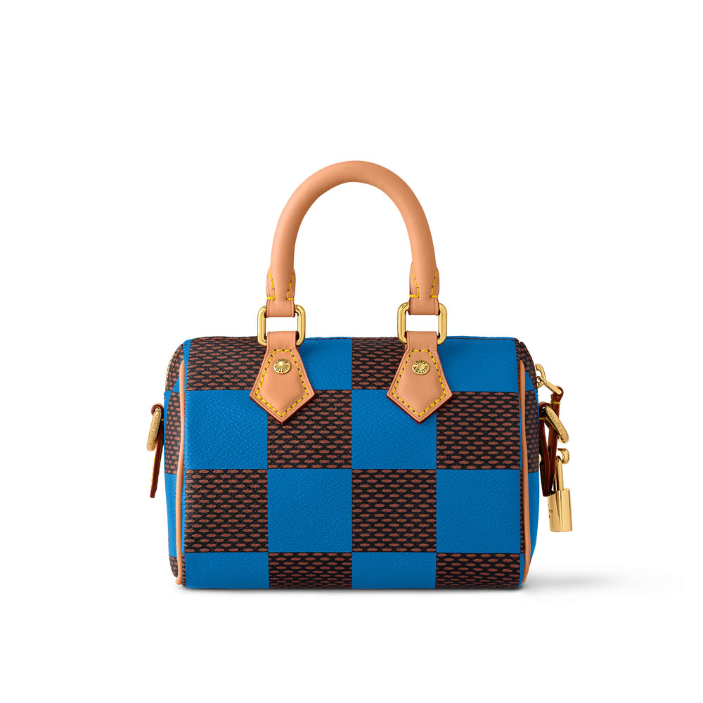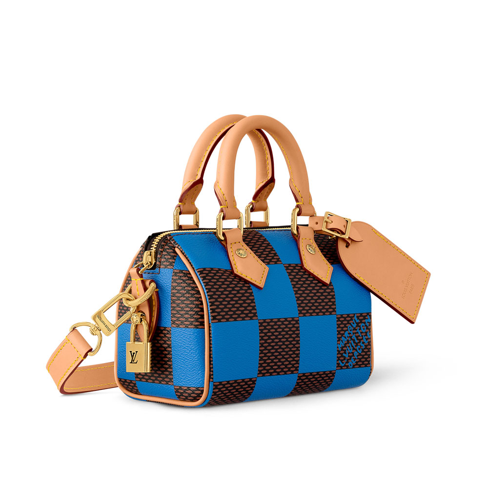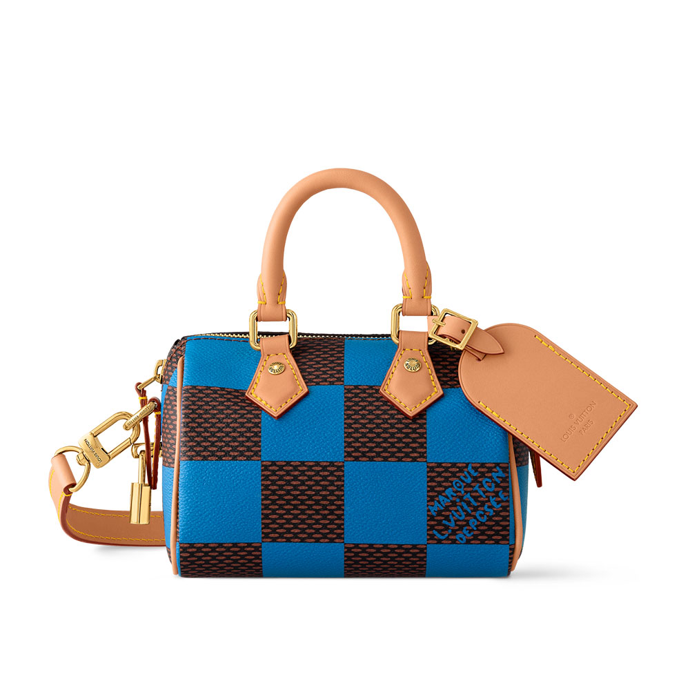 Inspired by the Speedy, a Louis Vuitton bag from the 1930s, the Speedy 18 Bandouliere is a miniature version made from Damier Pop coated canvas. By bringing a bright primary color to the Houses famed Damier checkerboard print, Creative Director Pharrell Williams has produced a canvas that perfectly matches the Speedys iconic lines.