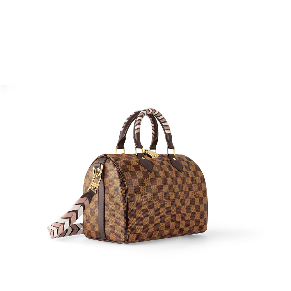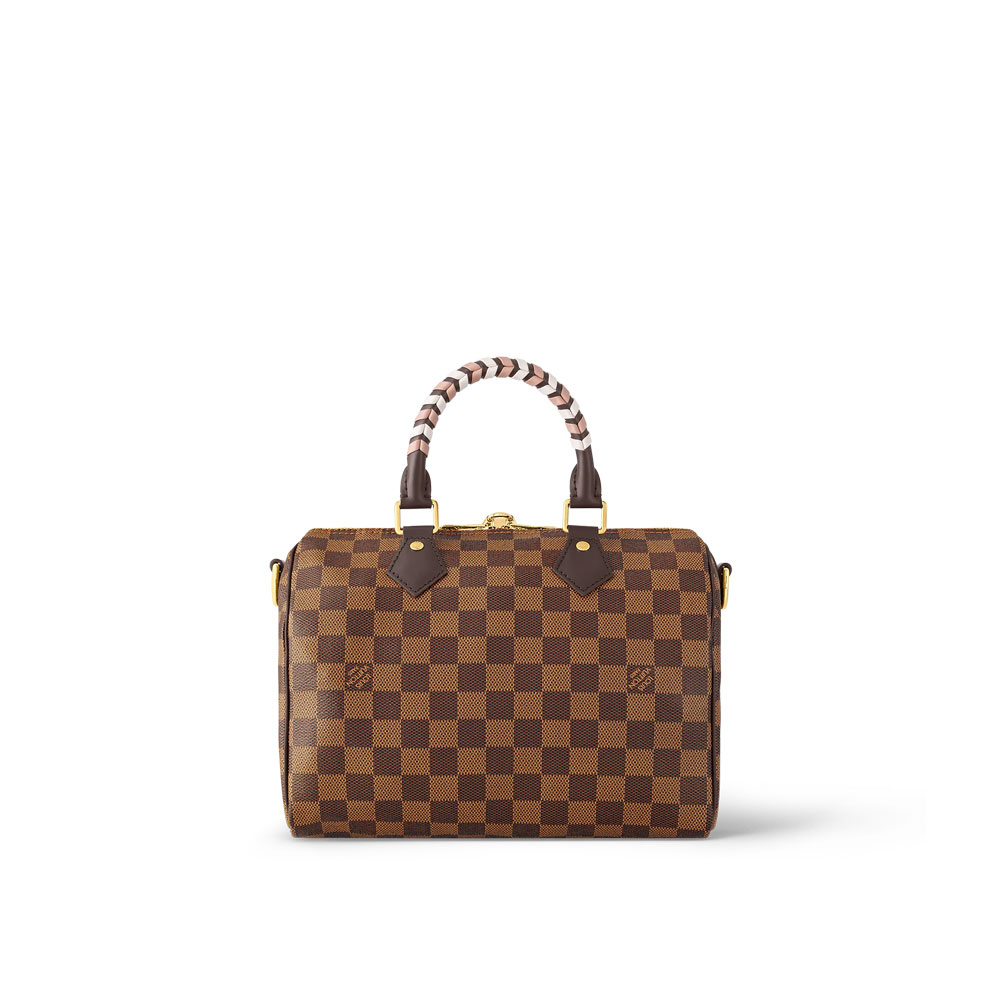 The Speedy 25 handbag greets the new season adorned with beautiful braided trim. Woven from pink- and cream-colored leather. the Toron handles and cross-body strap bring a fresh. feminine touch to the iconic Damier Ebene canvas. Gleaming gold-tone hardware adds the finishing touch to this classic city bag. an ideal choice for daily use.