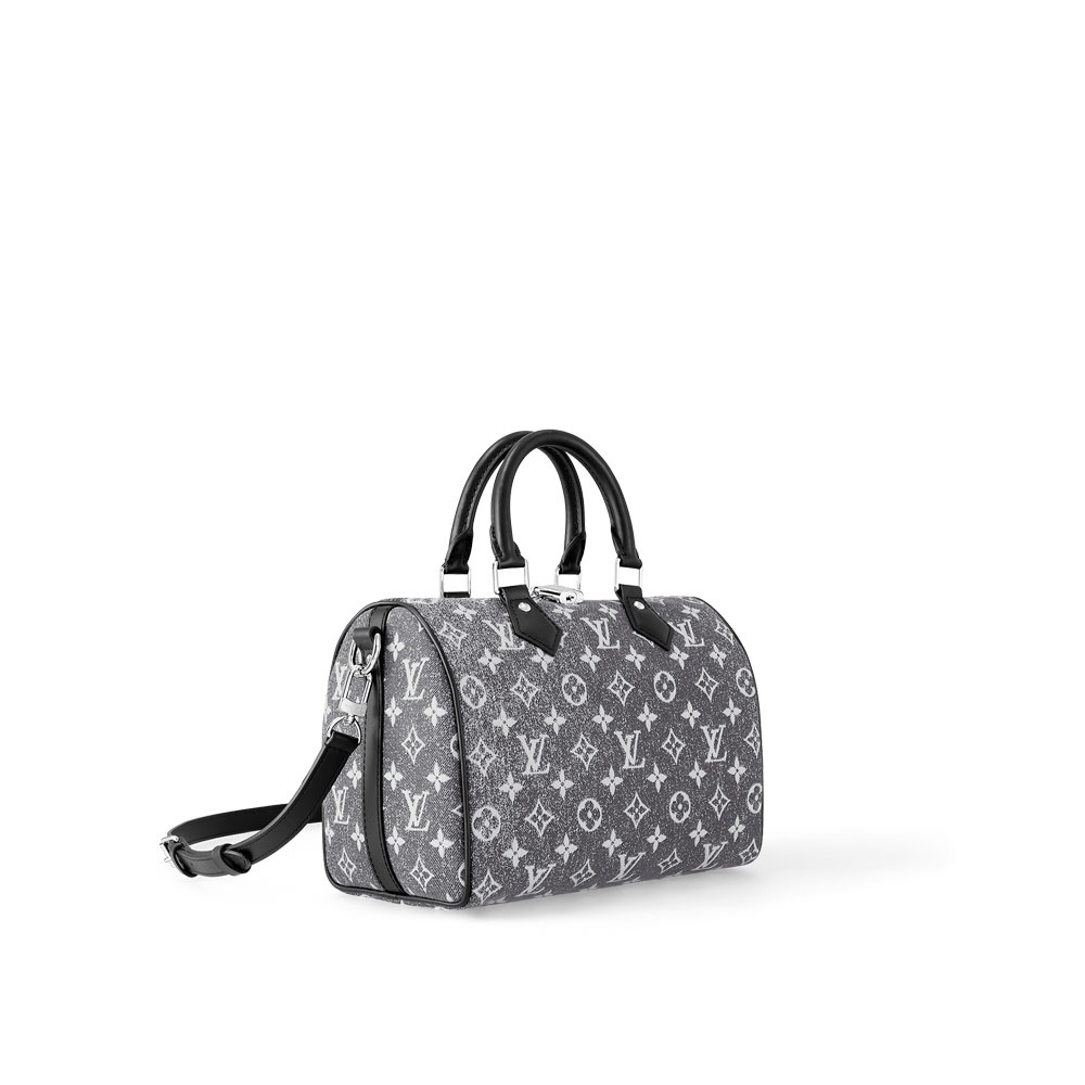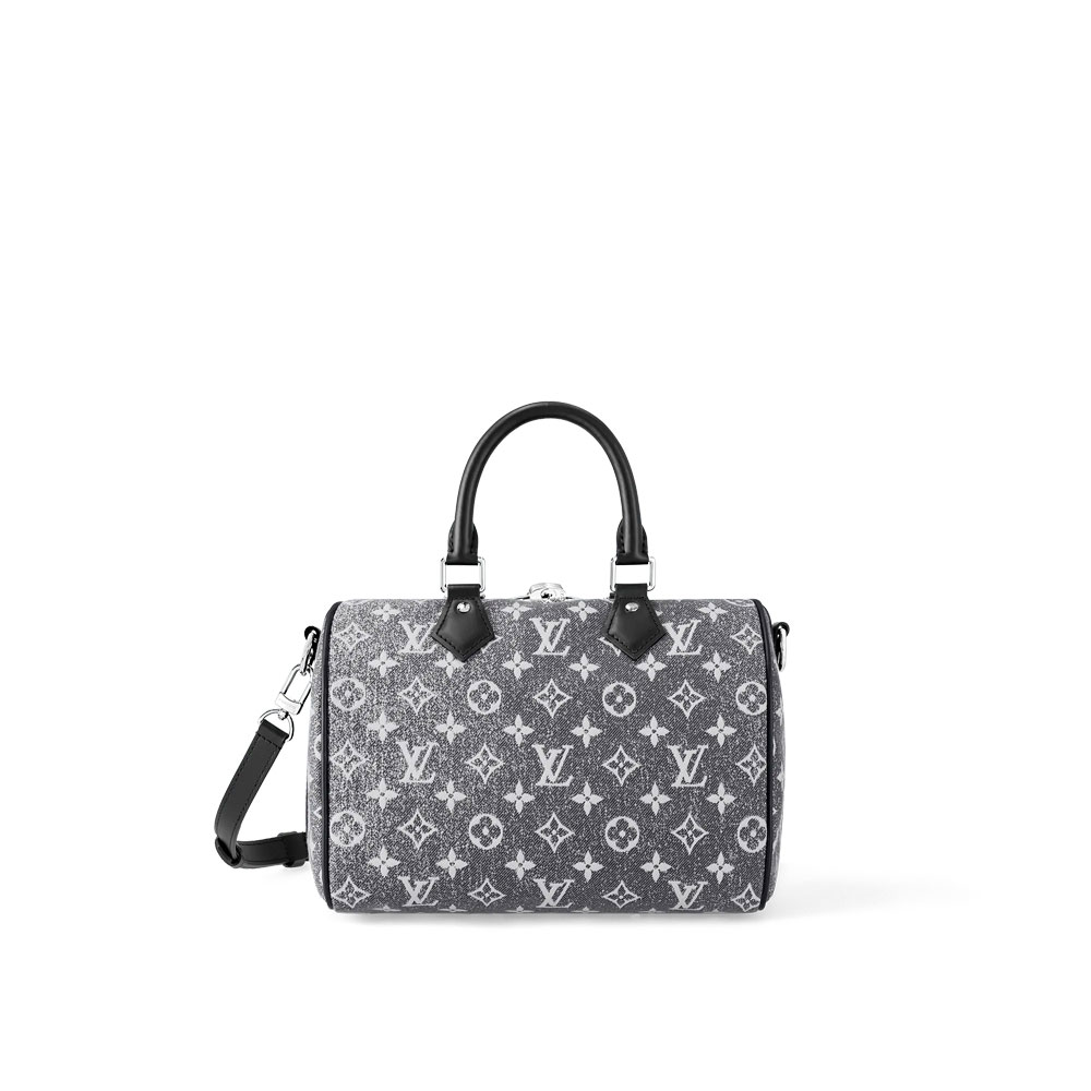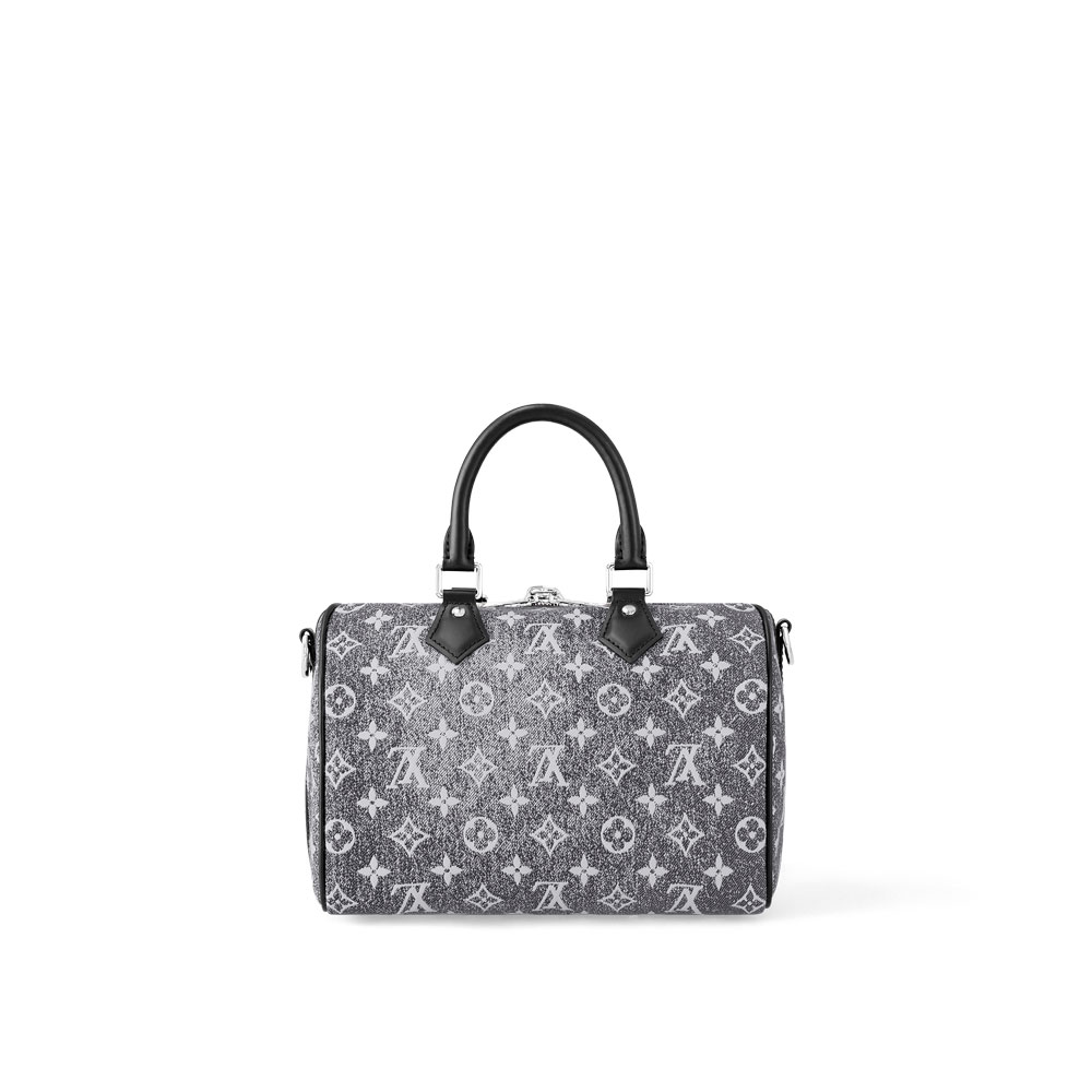 The iconic Speedy Bandouliere 25 handbag wears a new version of the Monogram pattern. unveiled at the Cruise 2023 show. Monogram Jacquard Denim is a gray. stone-washed effect canvas with a purposely raw aspect that contrasts creatively with the bag's black leather trim and silver-finish hardware. The reverse jacquard lining adds a playful finishing touch.