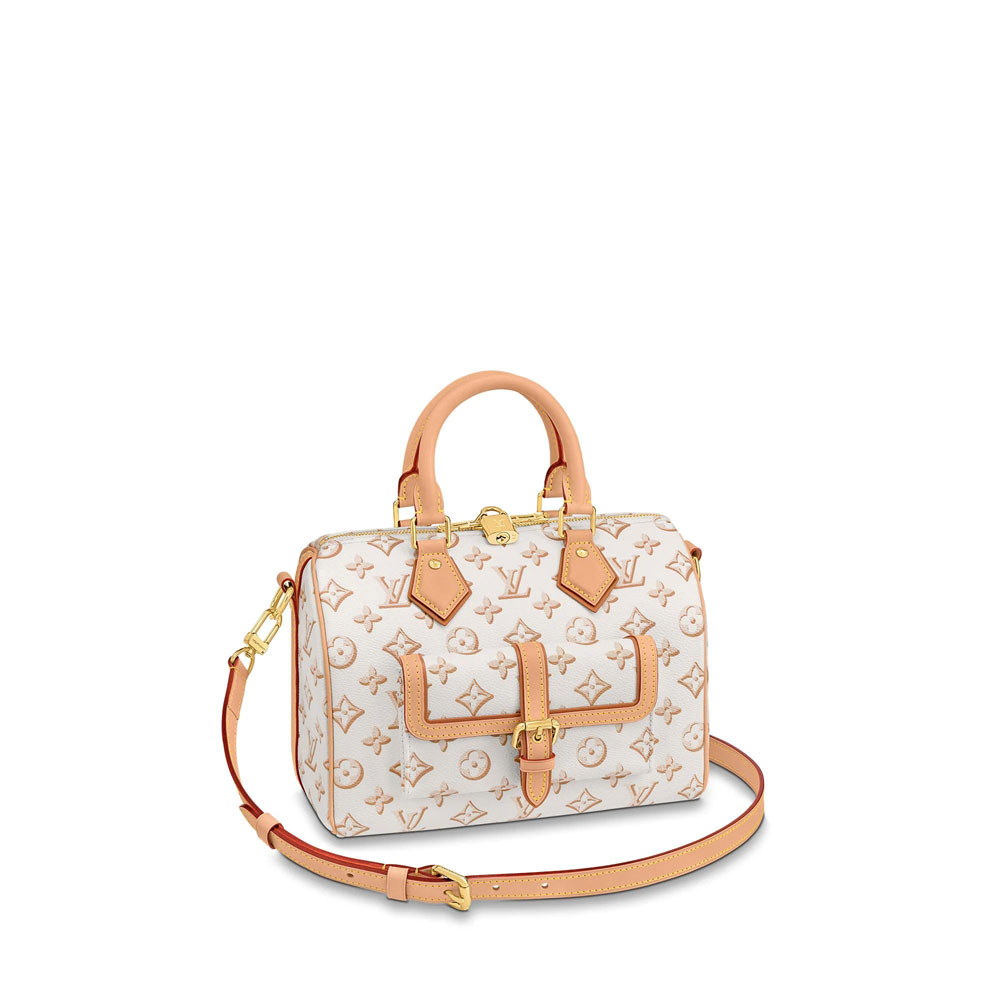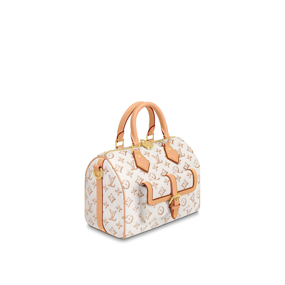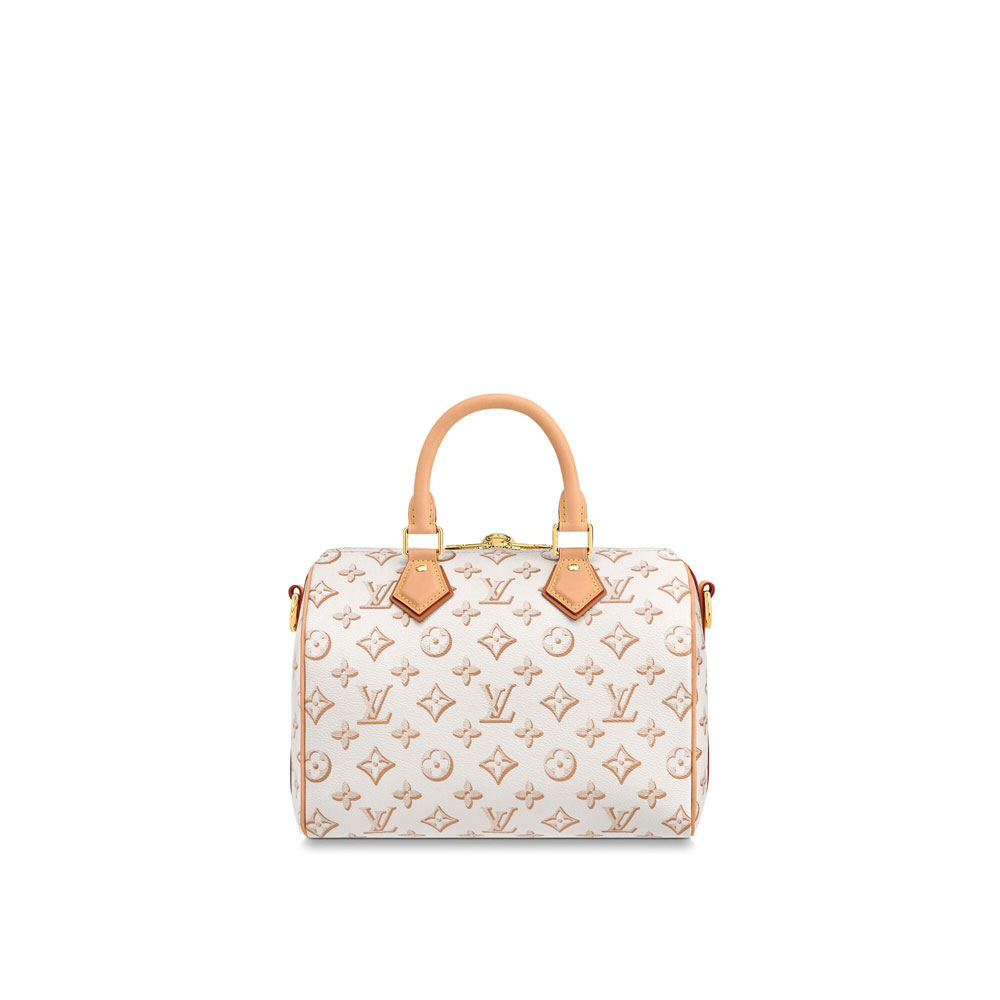 The compact Speedy Bandouliere 25 handbag reinvents its elegant silhouette with an outside pocket and gold-color buckle. The miniature Monogram pattern on the canvas and the leather trim evoke the House's historic design codes. as do the rolled-leather handles and engraved padlock. An adjustable and removable strap enables shoulder and cross-body carry.