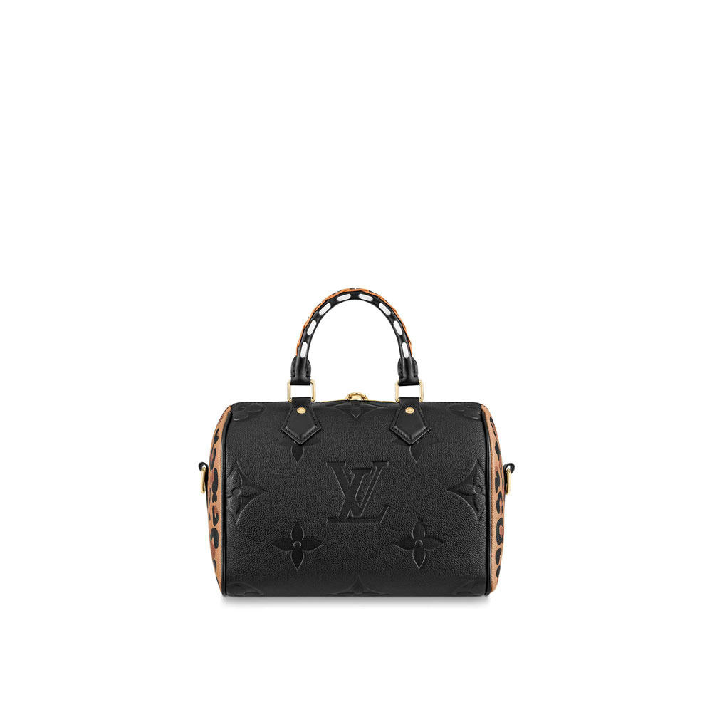 Revisited for the Fall 2021 Wild at Heart capsule. this Speedy Bandouliere 25 handbag makes a striking impression. It is fashioned from embossed Monogram Empreinte leather with an oversized LV pattern and a bold leopard print on the sides. The braided Toron handles are a signature of the capsule. and a detachable strap allows for cross-body wear.