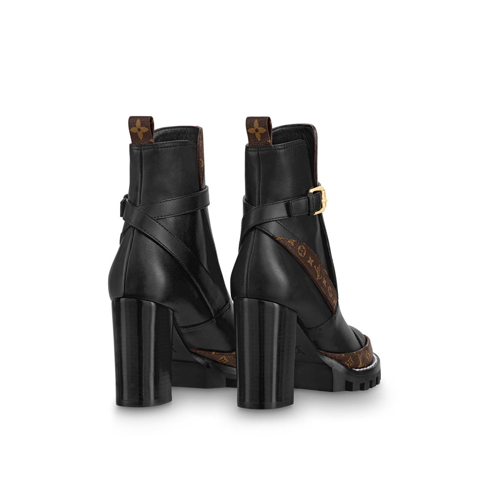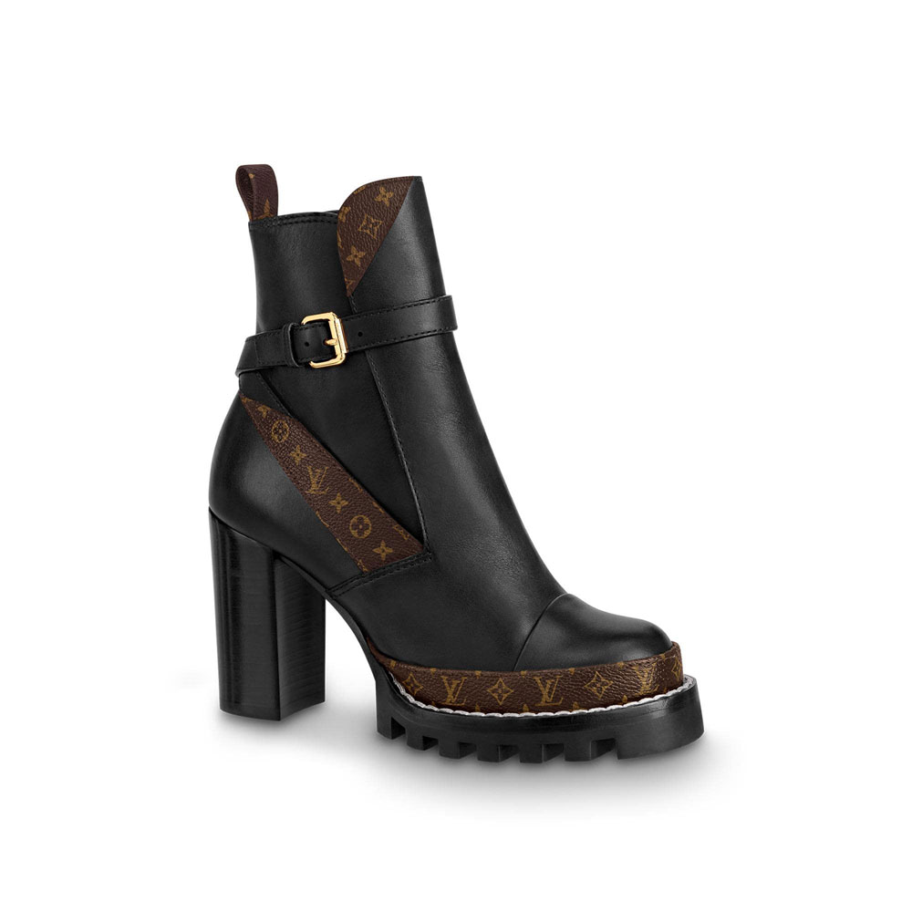 The iconic Star Trail ankle boot is revisited this season in supple calf leather with Monogram canvas trim. This model is characterized by its sturdy heel and treaded rubber outsole. while a platform construction adds extra height. The boot is adjusted by means of a gold-tone buckle engraved with the Louis Vuitton signature.
