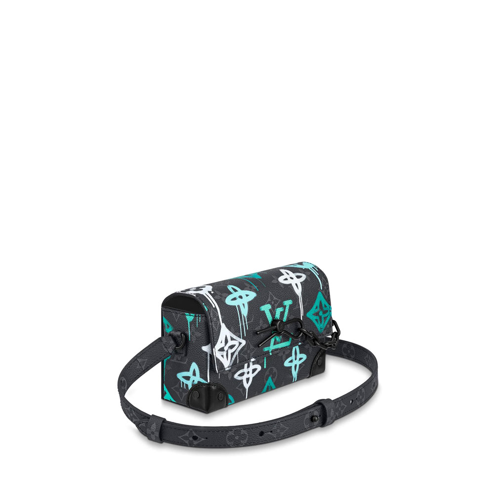 Fashioned from canvas with a graffiti-style print of the Monogram motif. the Steamer Wearable Wallet features design cues such as Virgil Abloh's chain-and-pin detail. An alternative for carrying small belongings. it's easy to wear thanks to its adjustable strap. The spacious compartment closes with a secure magnetic flap .