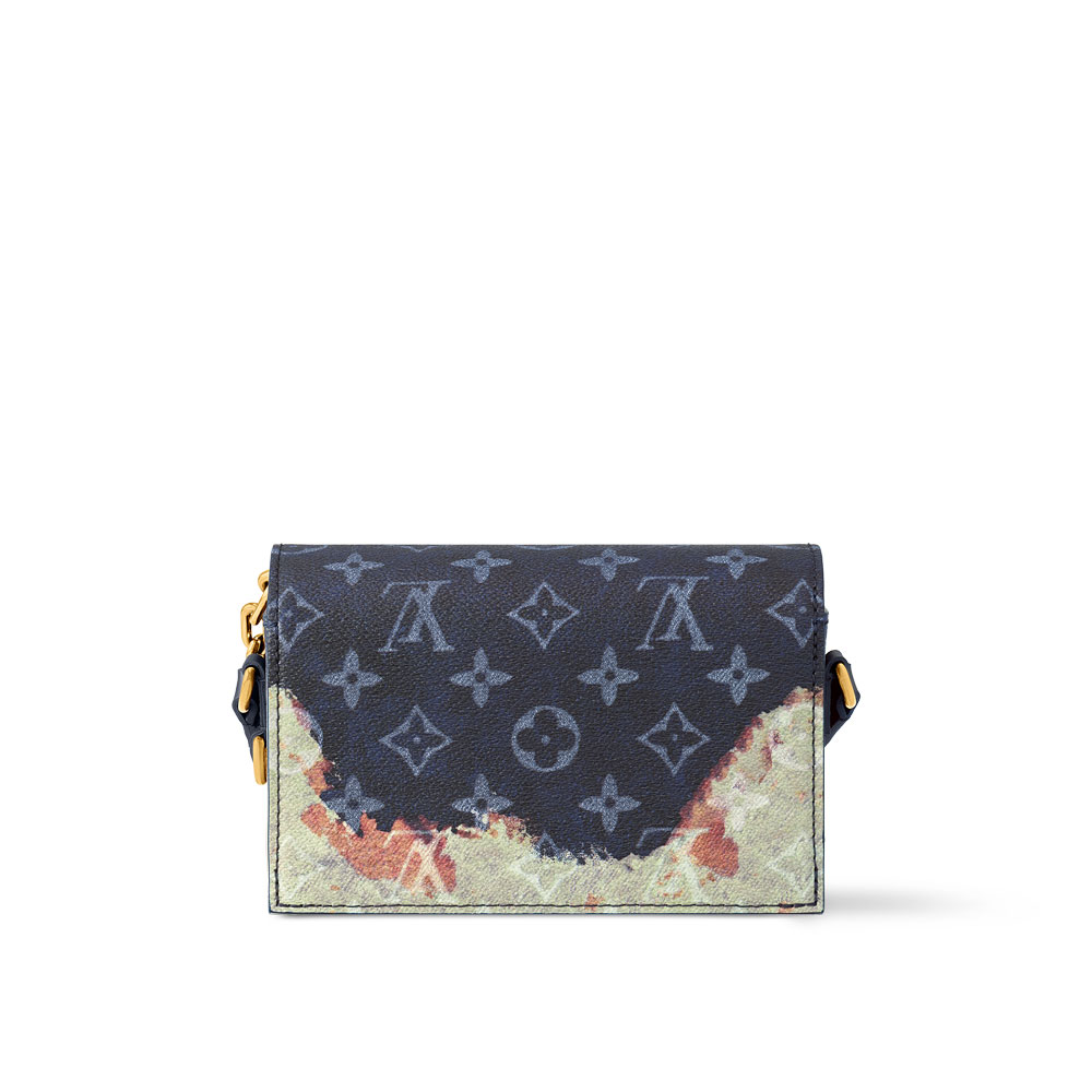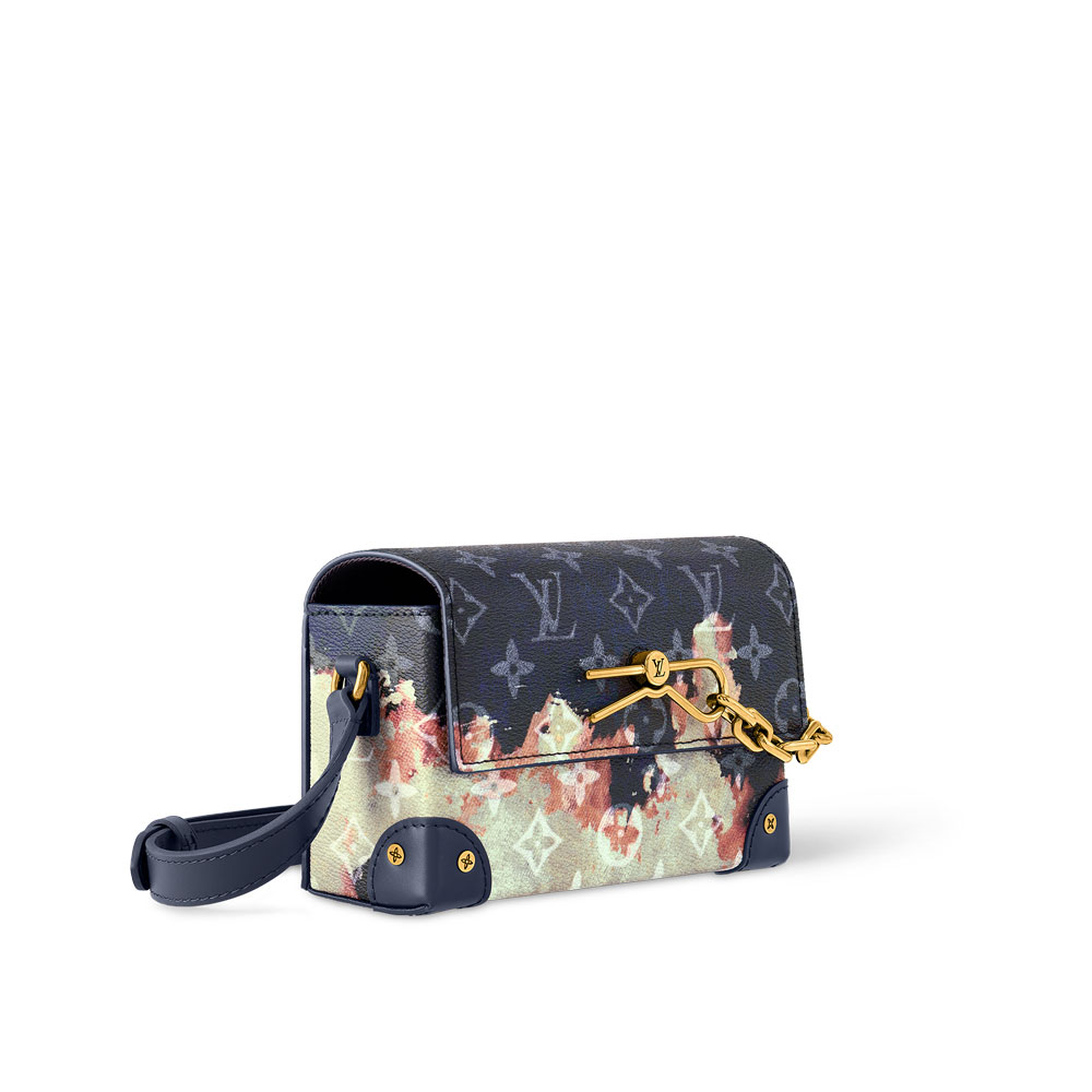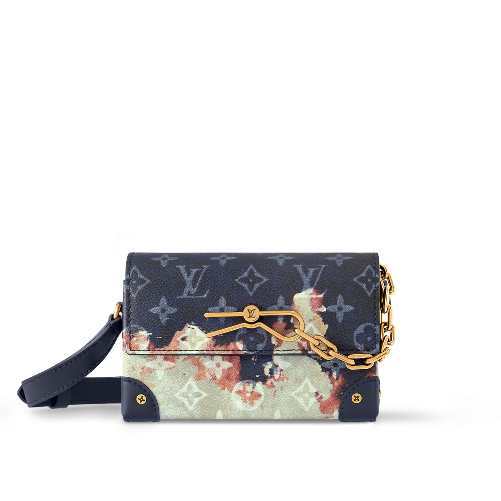 For Spring-Summer 2024, the Steamer wearable wallet features an impactful new print inspired by the look of bleached denim. Against a background of dark blue Monogram canvas, a pattern of pale colors evokes the ever-changing light of a bonfire a main theme of the collection. House details like reinforced corners and a steamer-style chain add a cool heritage touch.