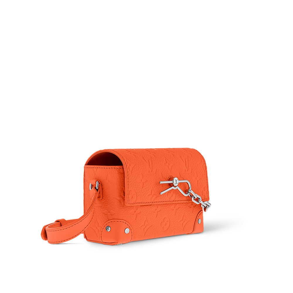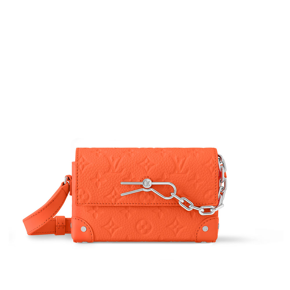 Inspired by the Houses vintage Steamer Trunk, the Steamer Wearable Wallet is fashioned from Taurillon cowhide leather in a bold summery colorway. Instantly recognizable by its pin and chain, the same found on the Streamer, it features an inside zipped pocket and magnetic closure to keep belongings secure.