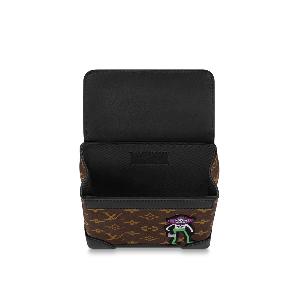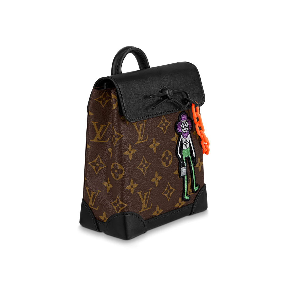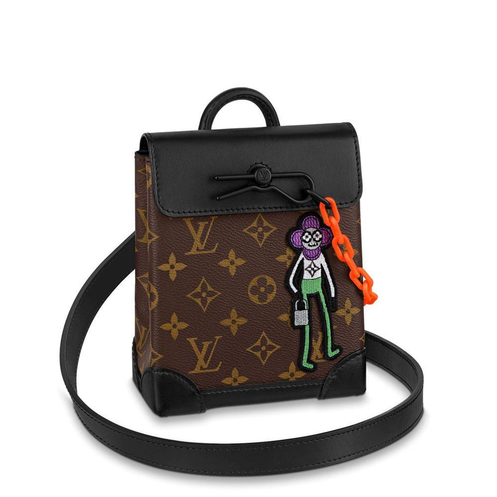 Fashioned from Monogram canvas with matte-black leather trim. this compact Steamer XS bag for men features an embroidered patch of a LV friend from Virgil Abloh's Zoom with friends animated film. The top handle and detachable shoulder strap mean it can be carried by hand or on the shoulder.