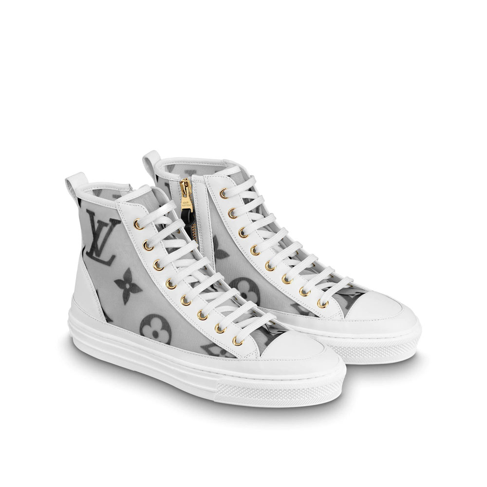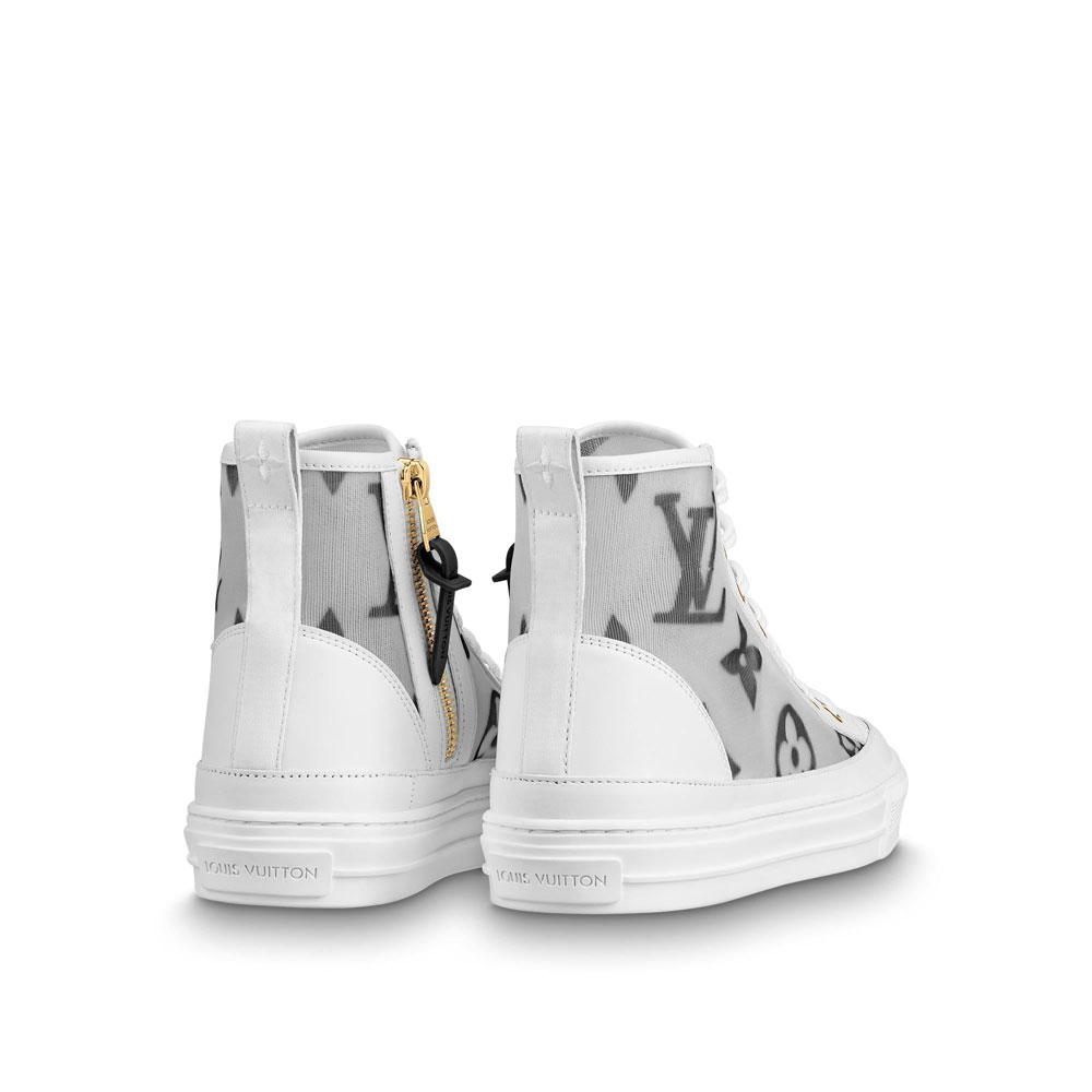 The iconic Stellar sneaker boot is revisited this season in a combination of calf leather and transparent technical fabric printed with the giant Monogram pattern. This classic hi-top features a side zip for easy fitting and a white rubber outsole with the Louis Vuitton signature at the back.