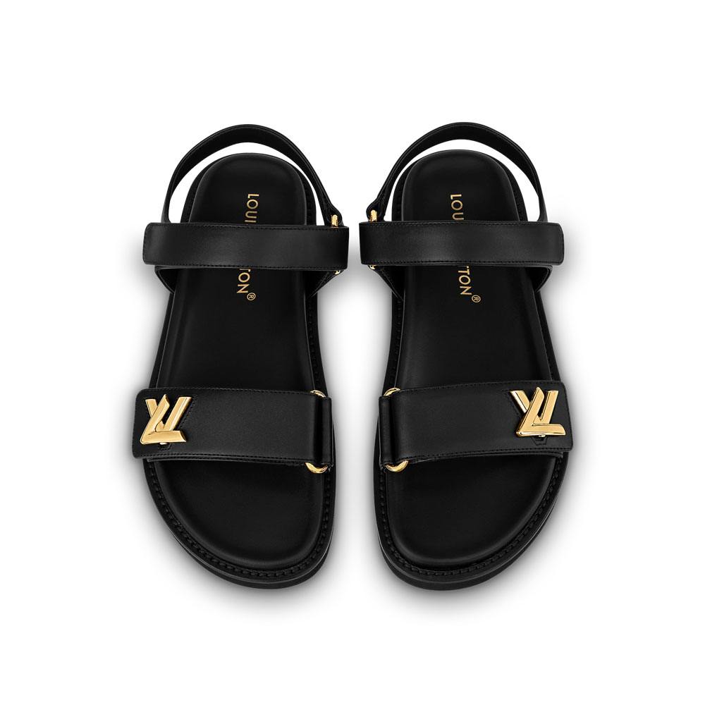 This version of the LV Sunset flat comfort sandal comes in extremely soft lambskin. This easy-to-wear style features two practical velcro straps. one of which is signed with a chunky. gold-tone LV accessory inspired by the clasp of the iconic Twist bag. A comfortable anatomic insole and lightweight micro outsole complete this design.