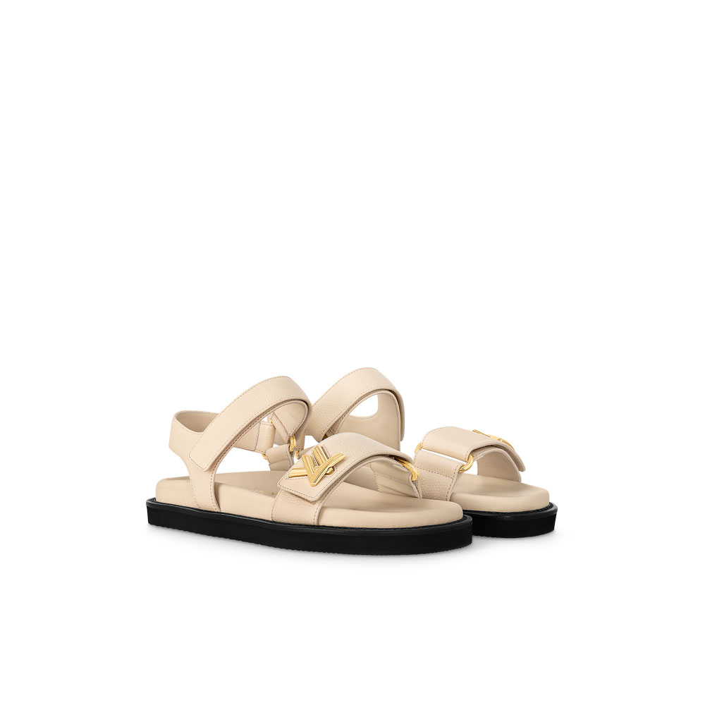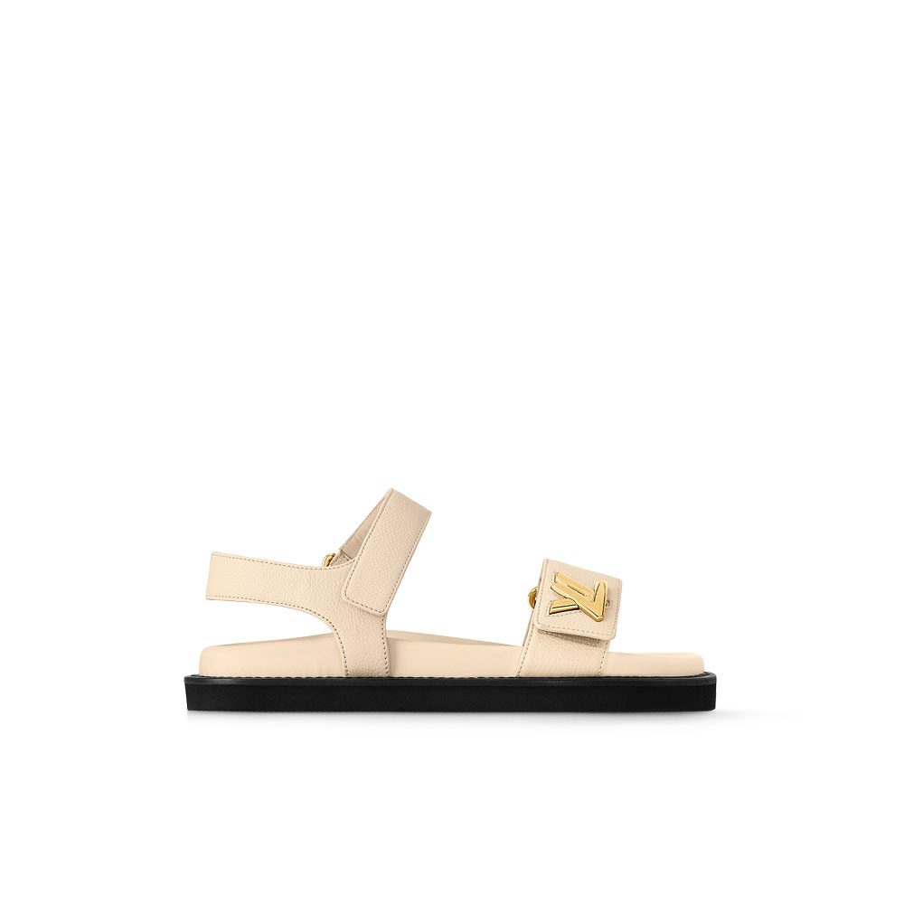 Sunset flat comfort mule comes in soft. Grained calf leather. Combining style with comfort and practicality. This model features an anatomic footbed and two adjustable velcro straps. The front strap is embellished with a chunky LV accessory in gold-tone metal. Which was inspired by the clasp of the iconic Twist bag.