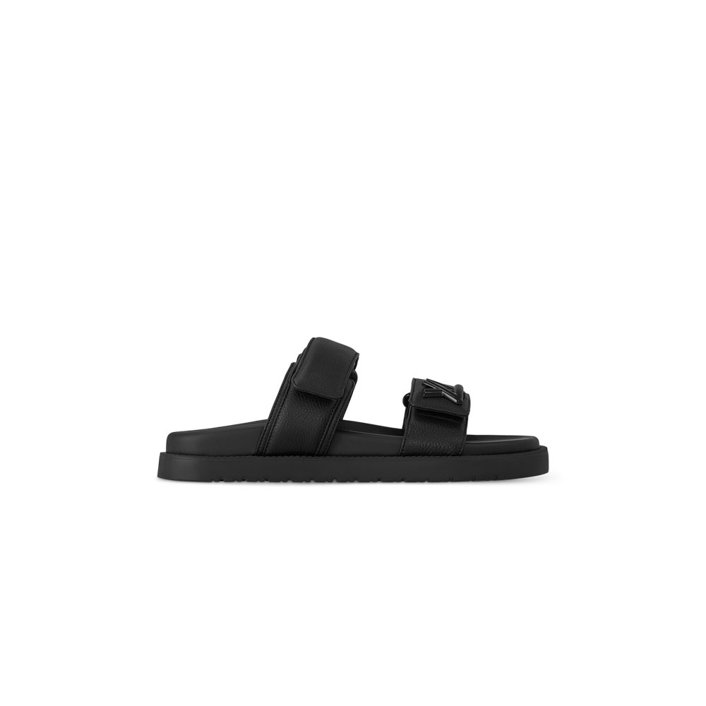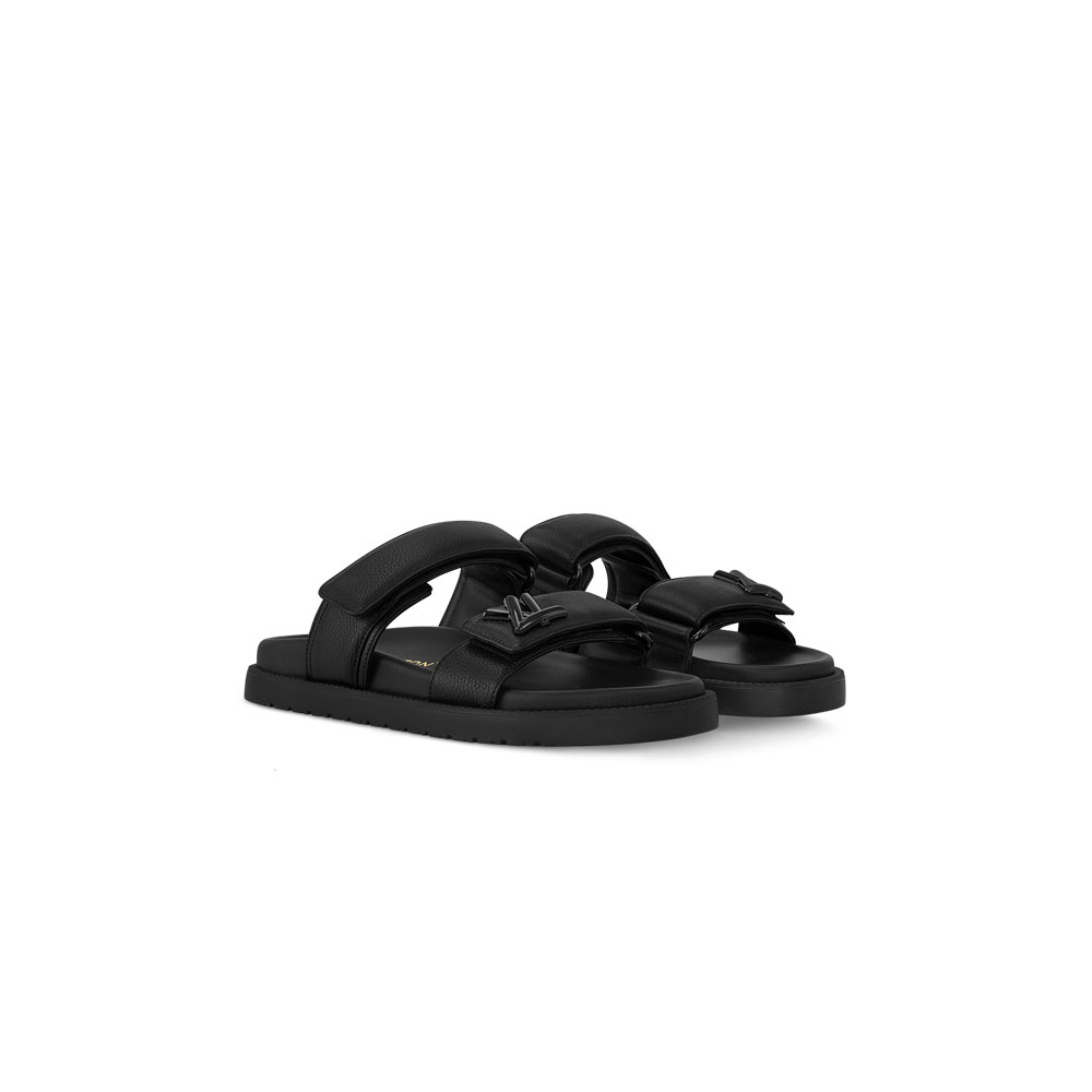 For the Prefall 2024 collection, the LV Sunset flat comfort mule is reinterpreted in grained calf leather. The supple leather complements this model's two lightly padded straps, which are conveniently adjusted with velcro. The front strap is signed with an LV Twist accessory, which is color-matched to the upper for a chic, tonal look.