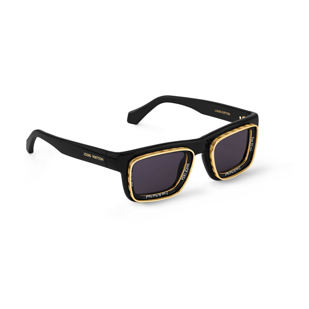 Drawing on photographic inspiration, these eyewear pieces celebrate a renowned artist's cinematic passion. LV brand elements shine in white against gilded frames bearing the signature checkered motif.