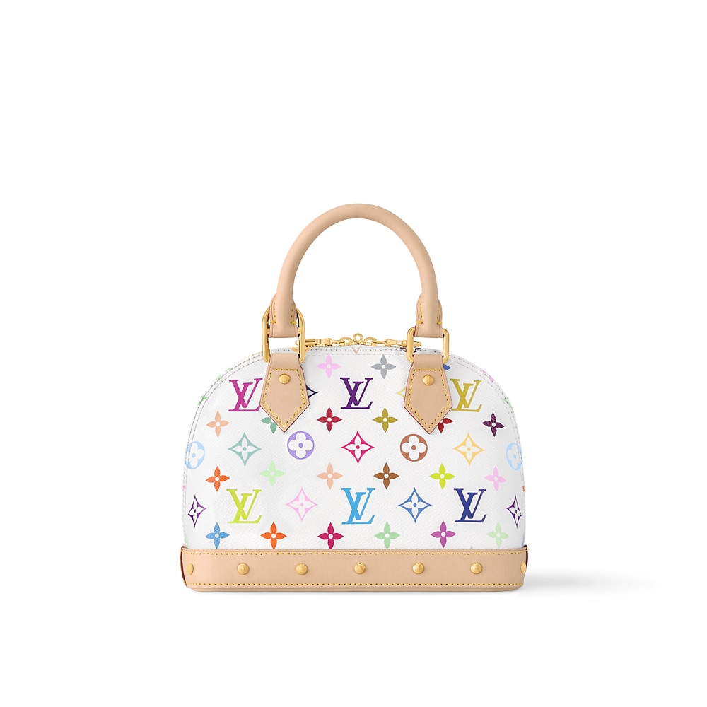 Originally inspired by a 1930s Art Deco design, this edition of the Alma BB has a celebratory spirit in the Louis Vuitton x Murakami collections multicolored Monogram coated canvas, which draws on the Japanese artists playful palette. The Houses natural cowhide leather adds an emblematic touch to the refined Toron top handles, the bottom, the removable strap, and the exclusive LV x TM keybell.