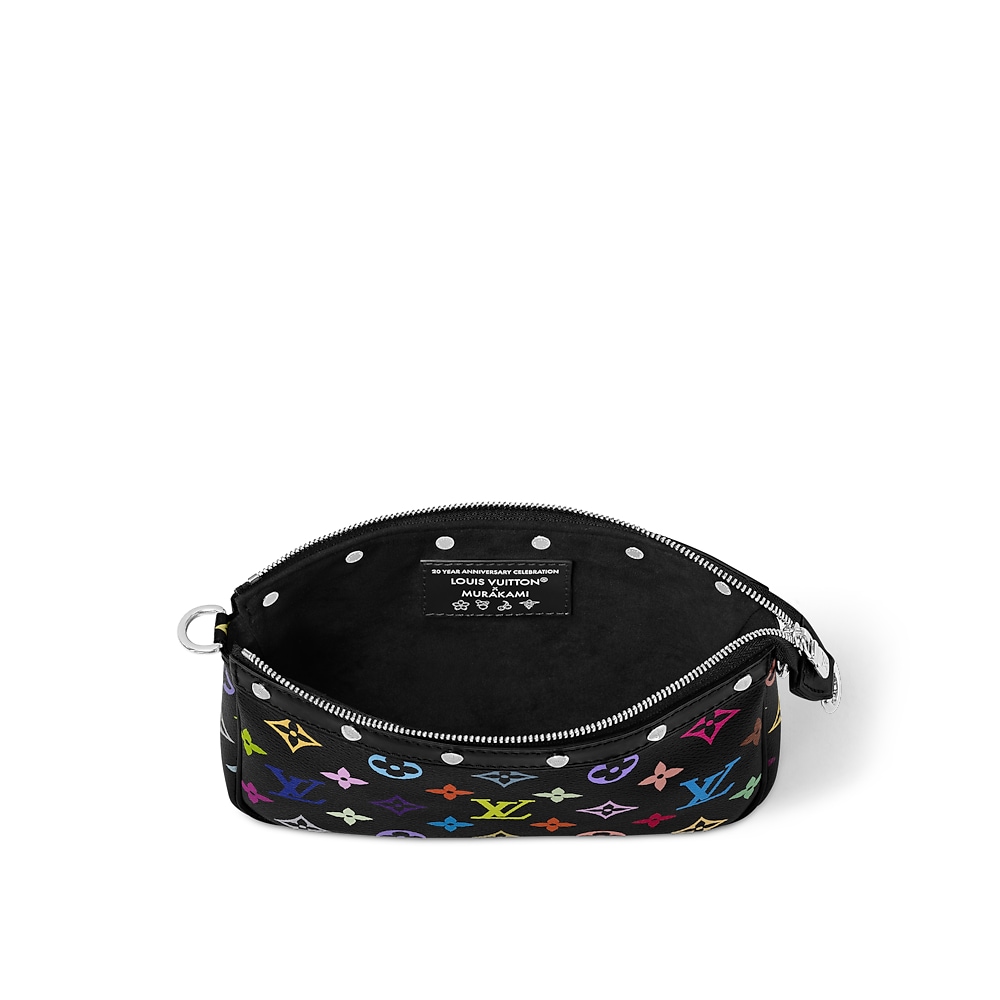 This playful edition of the classic Pochette Accessoires is joyfully reimagined with a multicolored Monogram motif as part of the cross-category Louis Vuitton x Murakami collection. Crafted from coated canvas in a petite pouch shape, a natural cowhide-leather trim adds an emblematic House touch, while golden hardware introduces a chic polished accent. Complete with a removable strap and chain for versatile styling options.