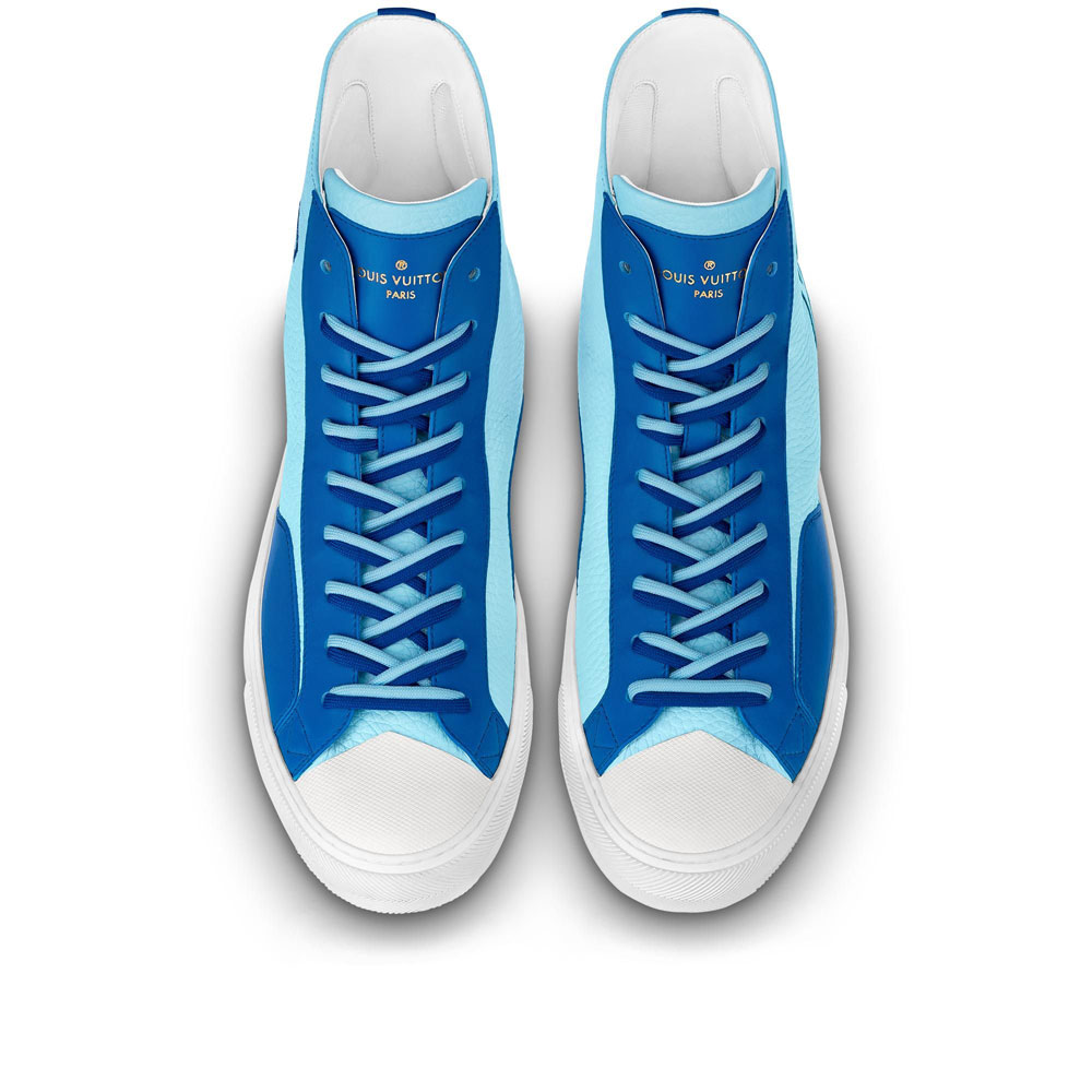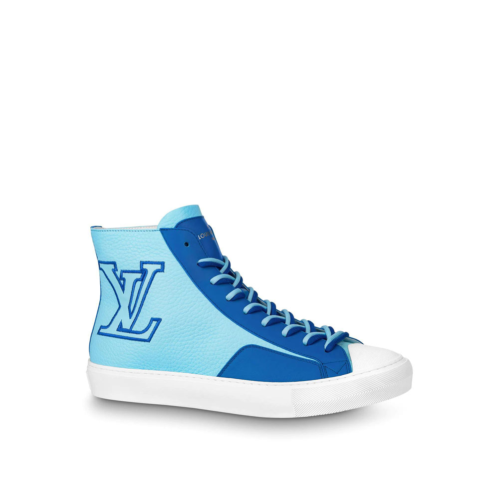 The Tattoo sneaker boot is revisited in supple. grained calf leather with contrasting smooth calf-leather trim. An oversized LV Initials logo is embroidered on the side. evoking a college spirit. Bicolor laces complement this classic hi-top. which is finished with a white rubber toe cap and outsole.
