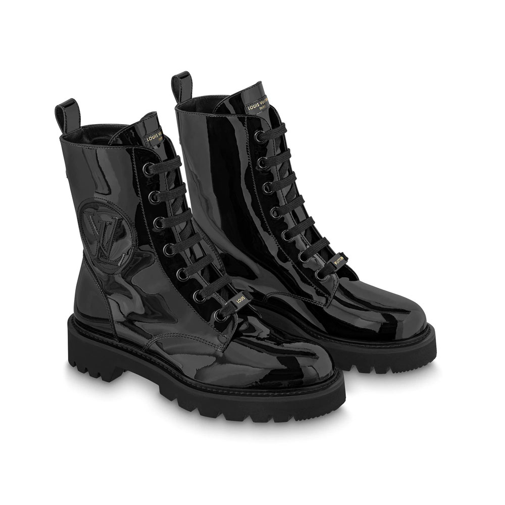 One of Louis Vuitton's iconic styles. the Territory flat ranger is revisited in glossy patent calf leather with tonal laces for a colorblock look. A large LV Circle signature is debossed. then stitched. on the side. This military-inspired design is finished with a sturdy rubber outsole.
