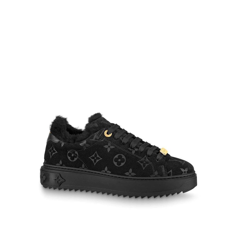 This model is distinguished by its on-trend. Elevated outsole. Which here comes in black rubber to match the upper. This model is finished with refined details. Such as the engraved. Gold-tone eyelets and embossed Louis Vuitton signature at the back.