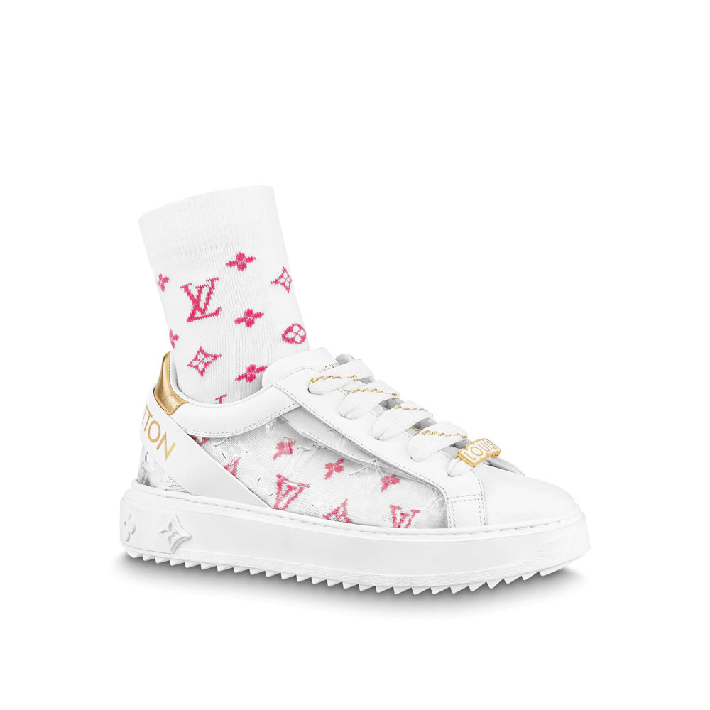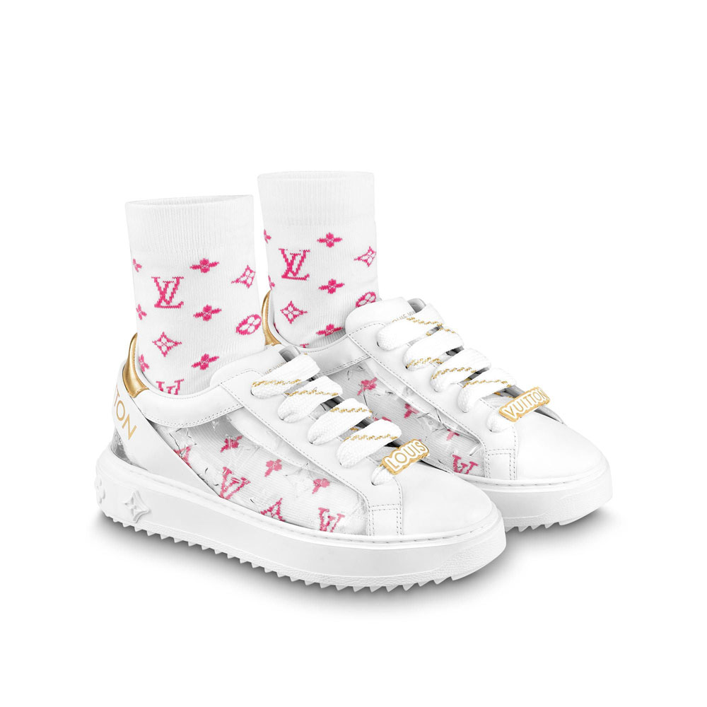 This fashion-forward rework of the emblematic Time Out sneaker in white calf leather features a transparent upper debossed with the Monogram pattern. which reveals a pair of Monogram socks (included with purchase). This design is also notable for its rich detailing. including engraved eyelets. Louis and Vuitton lace accessories. and extra-thick laces woven with shimmering lurex thread.