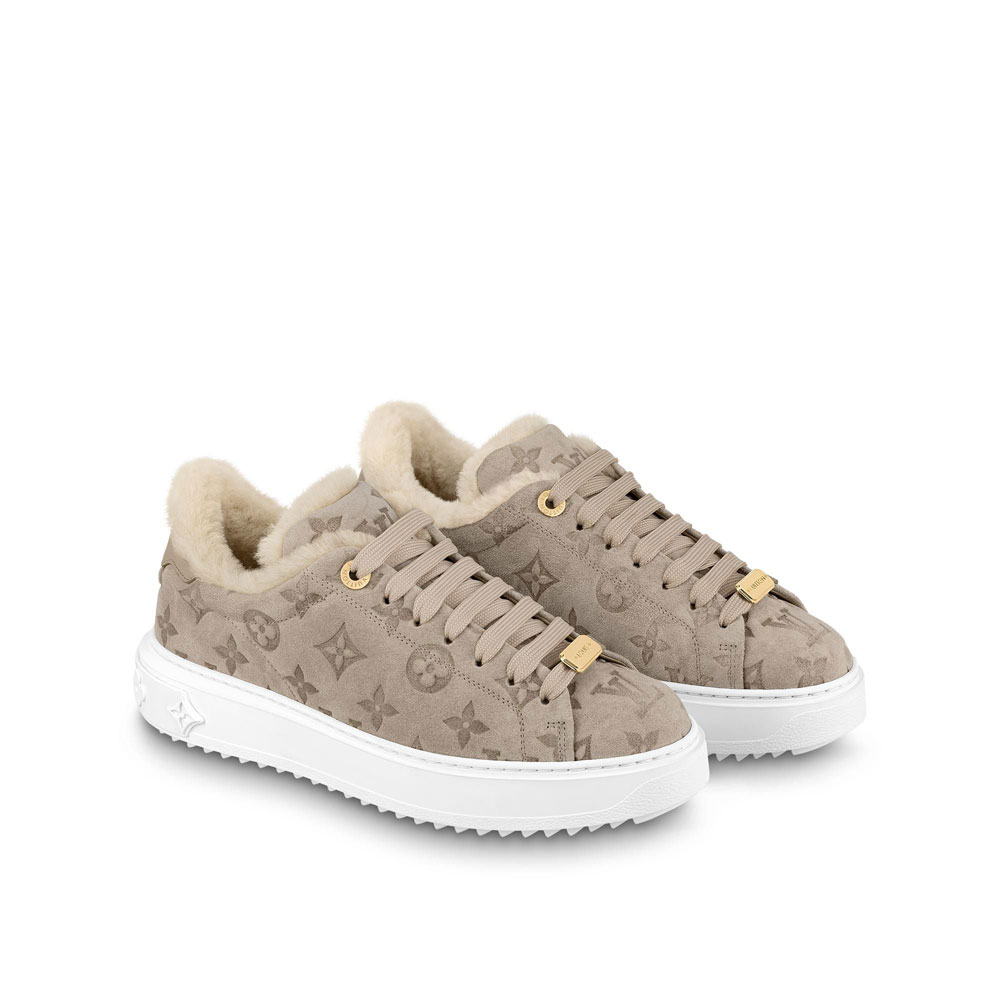 This wintry edition of the Time Out sneaker teams Monogram-embossed suede calf leather with fluffy shearling. One of Louis Vuitton's emblematic models. this sneaker is notable for its elevated. treaded outsole. decorated with a 3-D pattern of Monogram Flowers. It is complemented by refined details. such as the engraved. gold-tone eyelets.