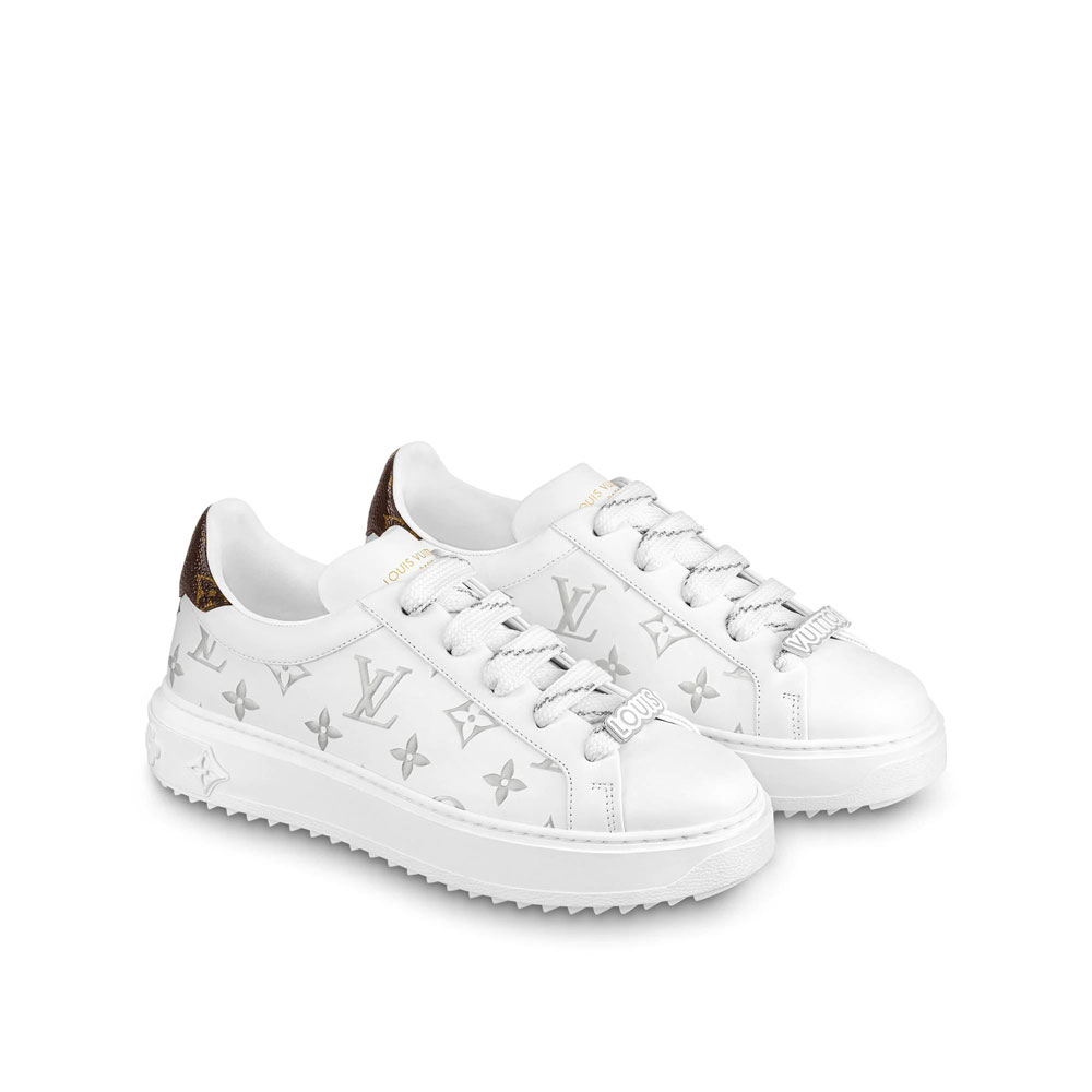 The iconic Time Out sneaker is revisited this season in supple calf leather with a debossed. metallic Monogram pattern. This model is notable for its refined details. including thick laces with shimmering lurex inserts. Louis and Vuitton lace accessories. and Monogram-canvas trim at the back. An elevated. treaded rubber outsole completes this fashionable. feminine design.
