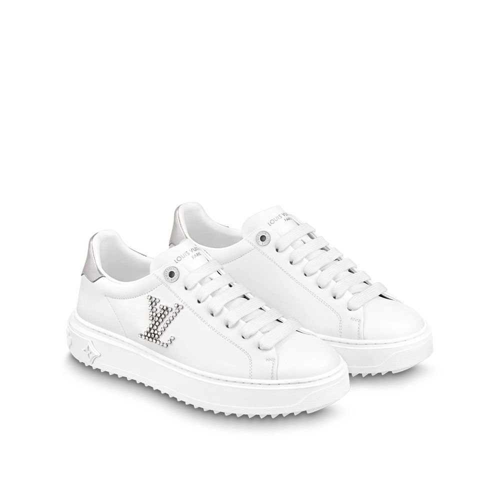 This glamorous iteration of the Time Out sneaker comes in soft calf leather with the LV Initials in shimmering crystals on the side. Other refined details further elevate this design. notably the metallic leather trim on the back and Louis Vuitton-engraved eyelets. This model is finished with an elevated rubber outsole decorated with Monogram Flowers.
