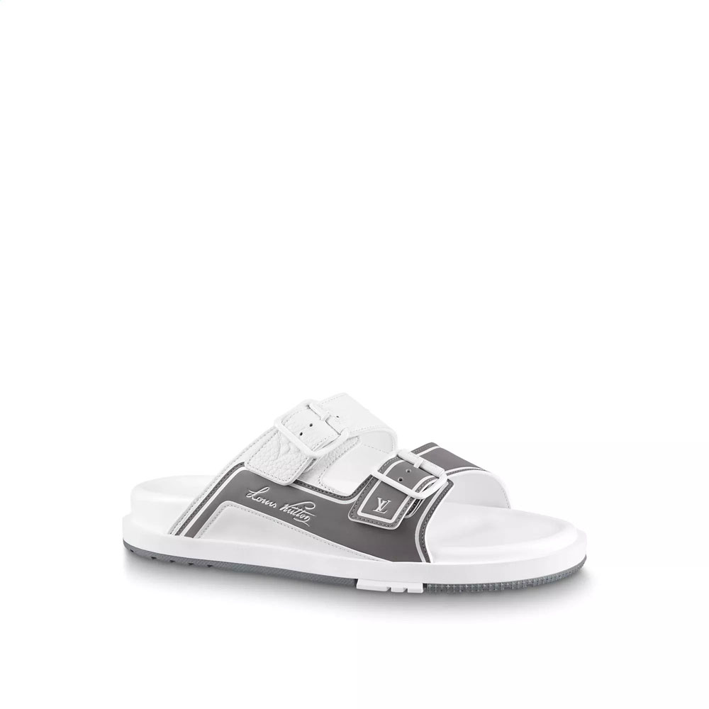 Inspired by the LV Trainer sneaker. the LV Trainer mule is a sporty design featuring adjustable straps. a comfortable anatomic insole. and a lightweight micro sole with a rubber outsole. This version comes in a mix of materials. including grained calf leather embossed with the Monogram pattern. The Louis Vuitton script signature is printed on the side.