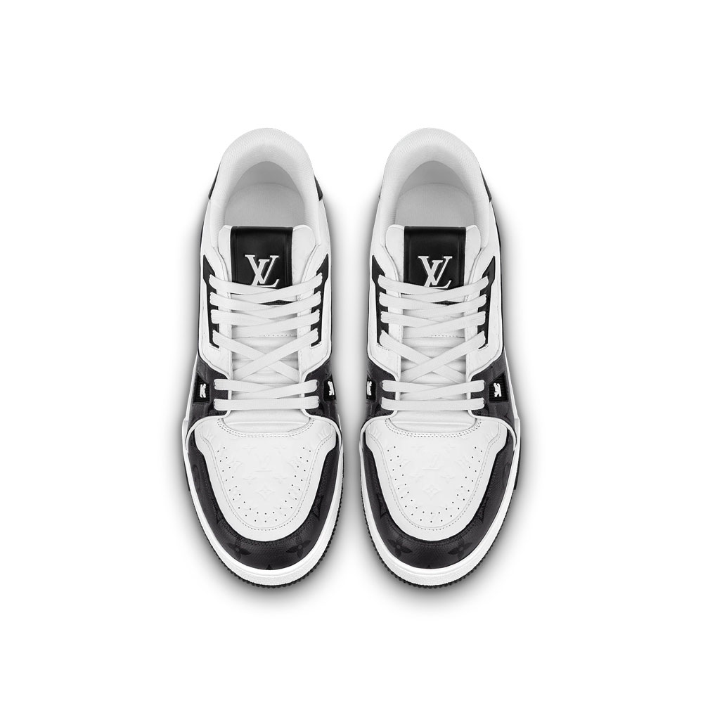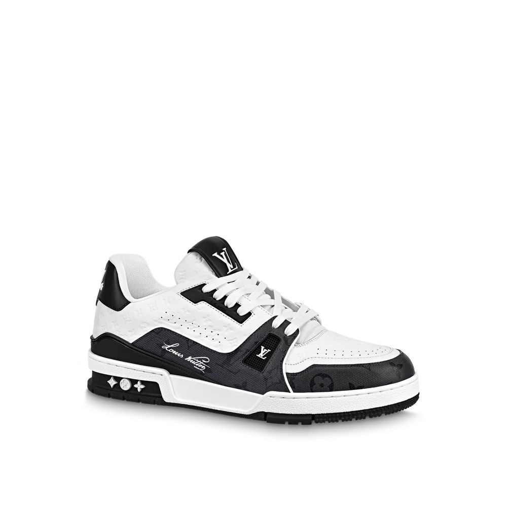 This version of the LV Trainer sneaker combines Monogram leather with calfskin embossed with the Mini Monogram pattern. Designed by Virgil Abloh. this iconic model was inspired by vintage basketball sneakers. Its elaborately constructed upper. which is notable for its rich detailing and Louis Vuitton signatures. takes seven hours to stitch.