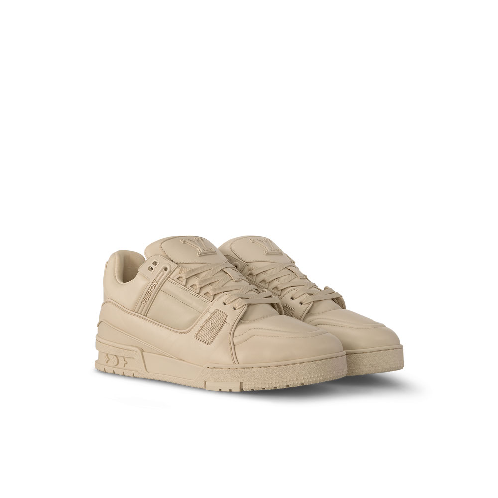 LV Trainer sneaker comes in soft calf leather with rubber LV Initials and Vuitton signatures. The outsole. Which is decorated with Monogram Flowers. Is color-matched to the upper for a striking monochrome look. Originally designed by Virgil Abloh. This cult model was inspired by vintage basketball sneakers.