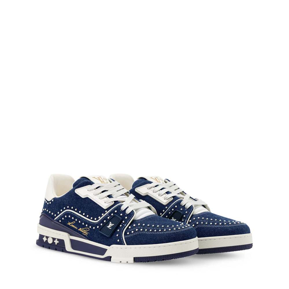 Explore the iconic Louis Vuitton LV Trainer - now featuring a stunning denim design adorned with Swarovski pearls. This luxurious sneaker showcases meticulous craftsmanship through its detailed upper construction.