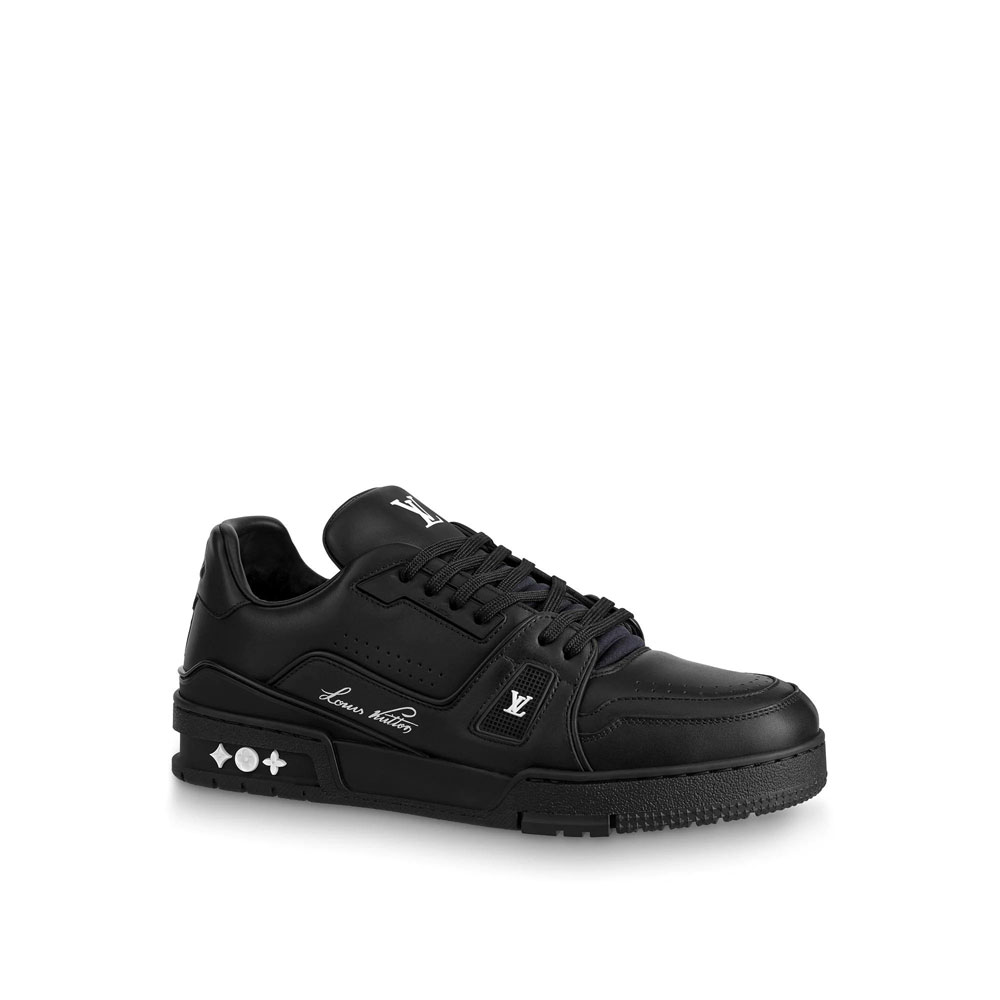This wintry version of the iconic LV Trainer sneaker comes in supple calf leather with a warm wool lining. The rubber outsole is color-matched to the upper for an all-black look. complemented by red detailing on the LV Initials. Virgil Abloh's handwritten Louis Vuitton signature is printed in silver on the side.