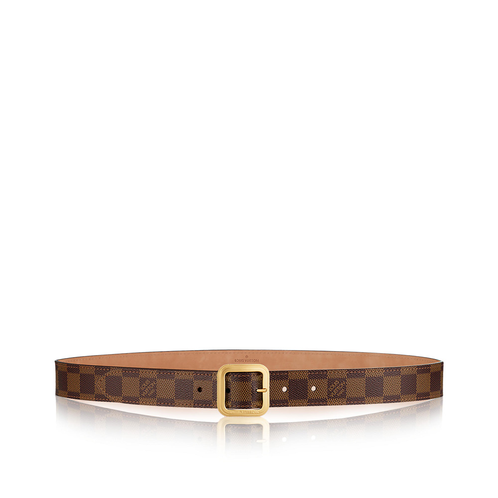 The Tresor belt in historic Damier canvas features a distinctive square buckle inspired by the push-buttons of the S-locks on Louis Vuitton trunks. This feminine belt will accessorize both elegant and casual looks with style.