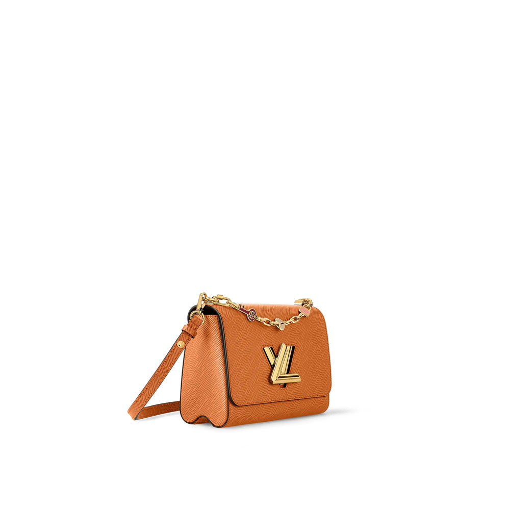 The gold-color chain. decorated with enamel charms inspired by the House's classic padlock. brings a feminine feel to this Twist MM handbag. Crafted from grained Epi leather and signed with a gold-color LV Twist lock. this Twist has adjustable and removable strap for shoulder and cross-body carry.