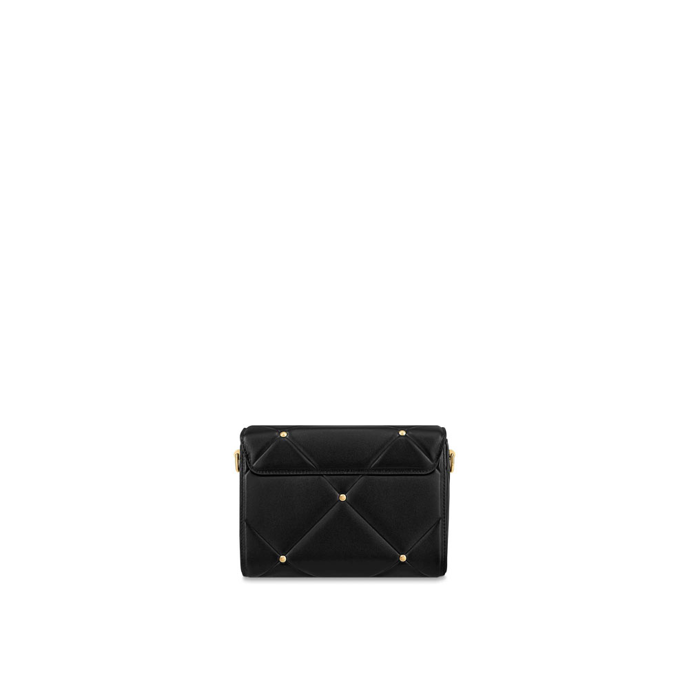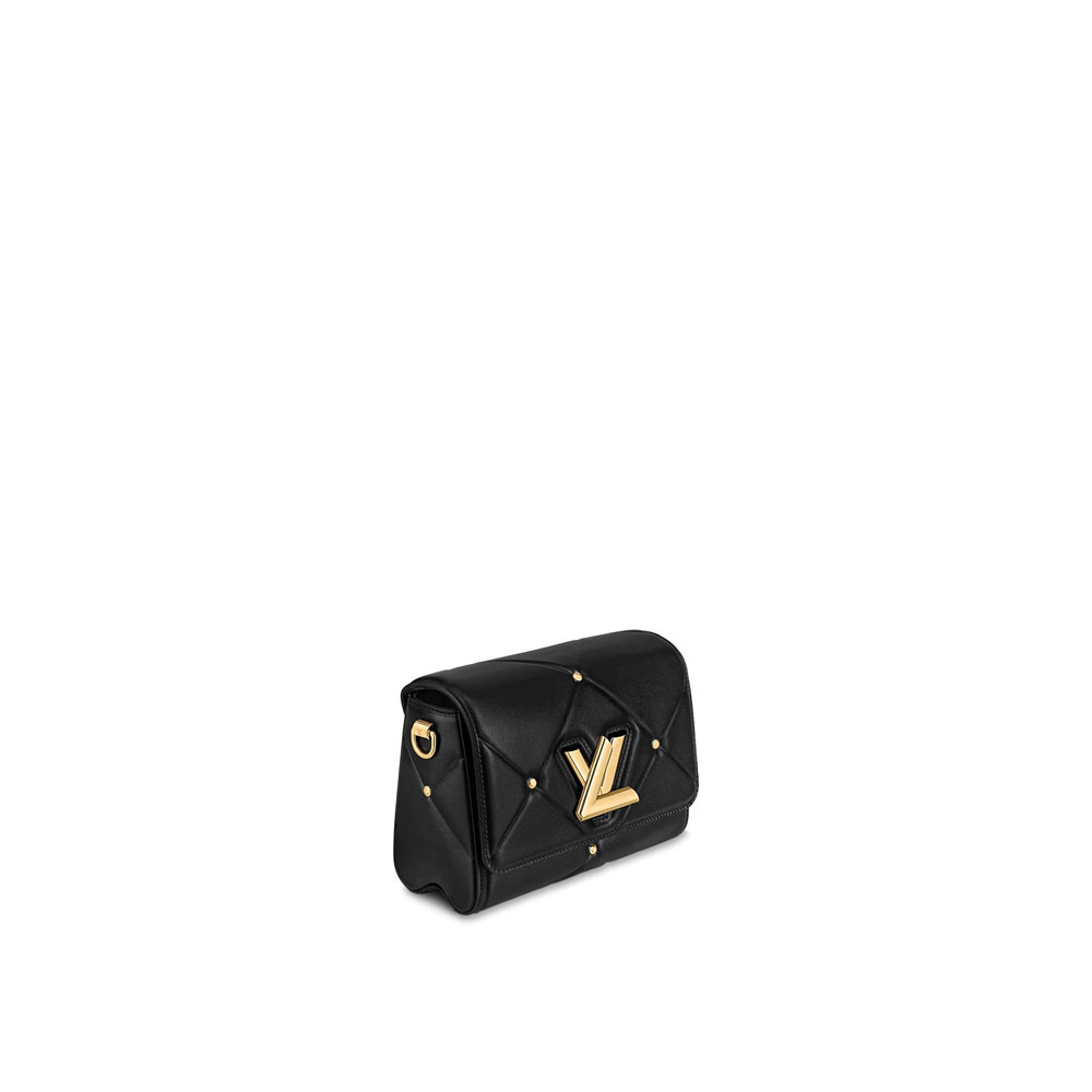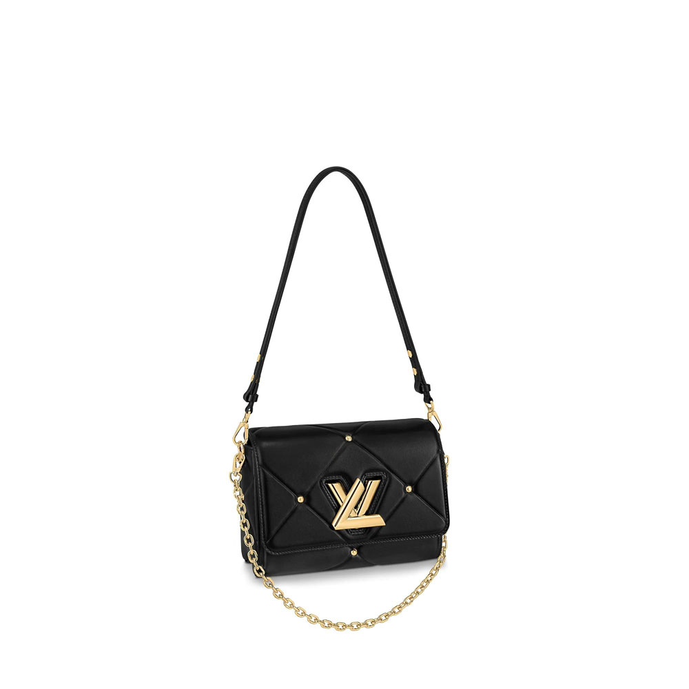This quilted Twist MM handbag is made from lambskin leather and is accentuated by gold-color studs. This puffer aspect is found across numerous House accessories this season and is complemented by the signature LV Twist lock and chain. also in a gold color. The removable leather smart strap enables a variety of carrying options.