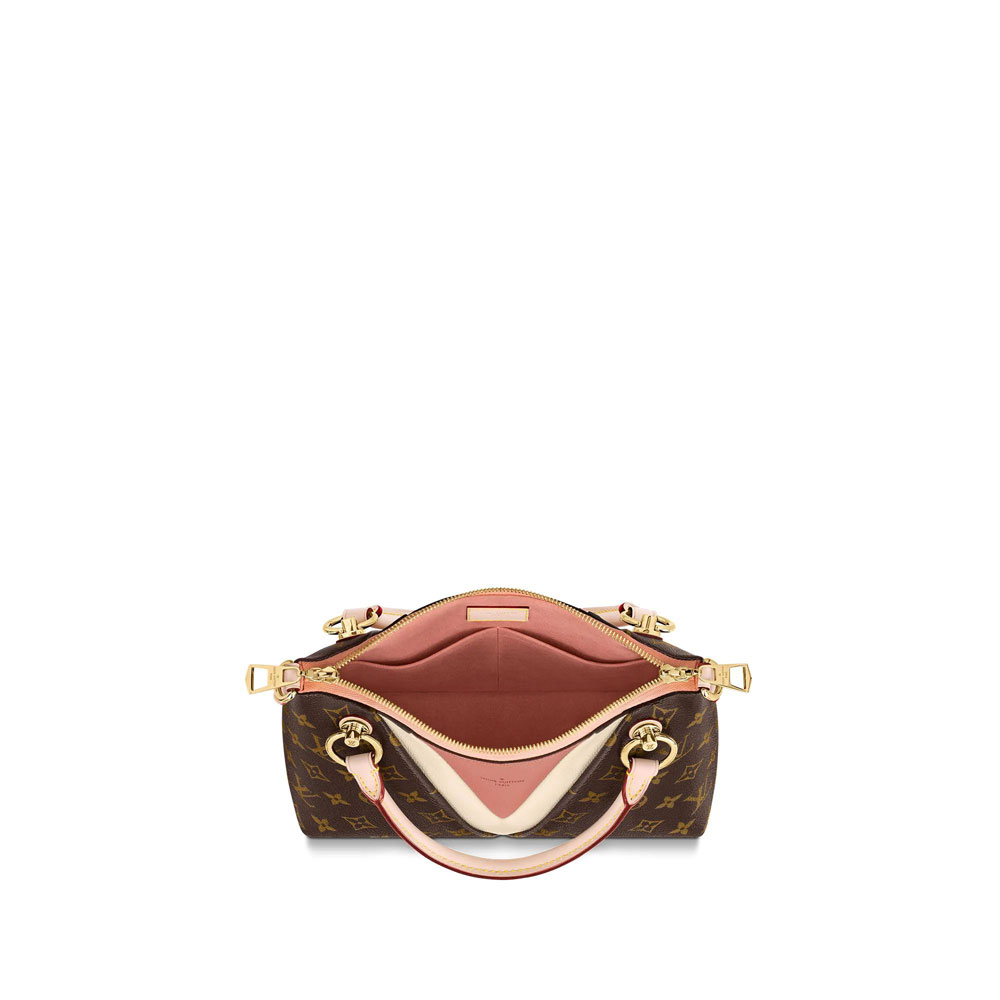 Inspired by the V of Vuitton. the V Tote handbag is fashioned from Monogram canvas with a large triangular panel in grained leather. It is accessorized with gold-color hardware and a leather nametag and can be carried as a handbag or over the shoulder thanks to its removable strap.