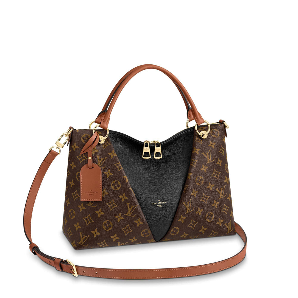 For Fall-Winter 2018. Monogram canvas is combined with grained leather in the V Tote MM handbag. It features a front panel of cowhide leather in a V shape. evocative of the initial of Vuitton. that hides a zipped front pocket. The gold-tone hardware and LV engraved handle-mount rings add shine to this elegant and functional bag.