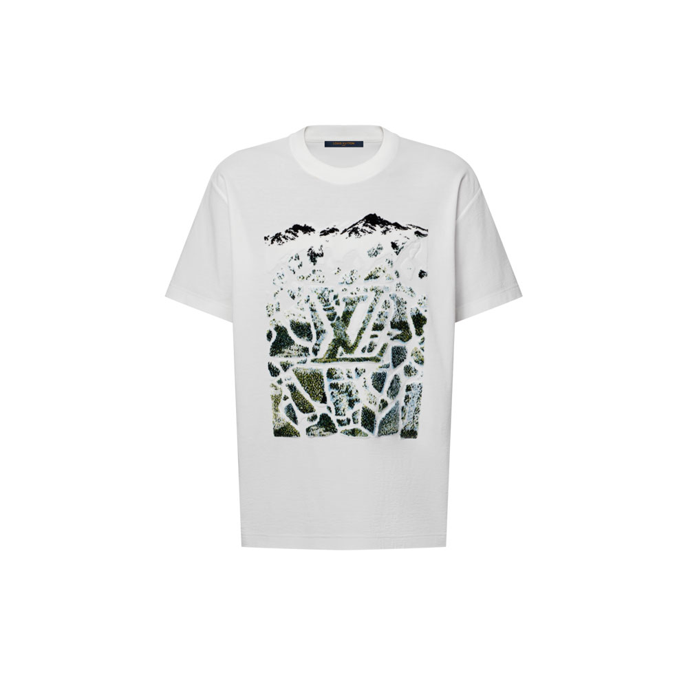 Crafted from premium organic cotton, this sophisticated white T-shirt features Louis Vuitton's distinctive velvet jacquard Mountain design. The textured front showcases snowy peaks and dense forests with exquisite detail.