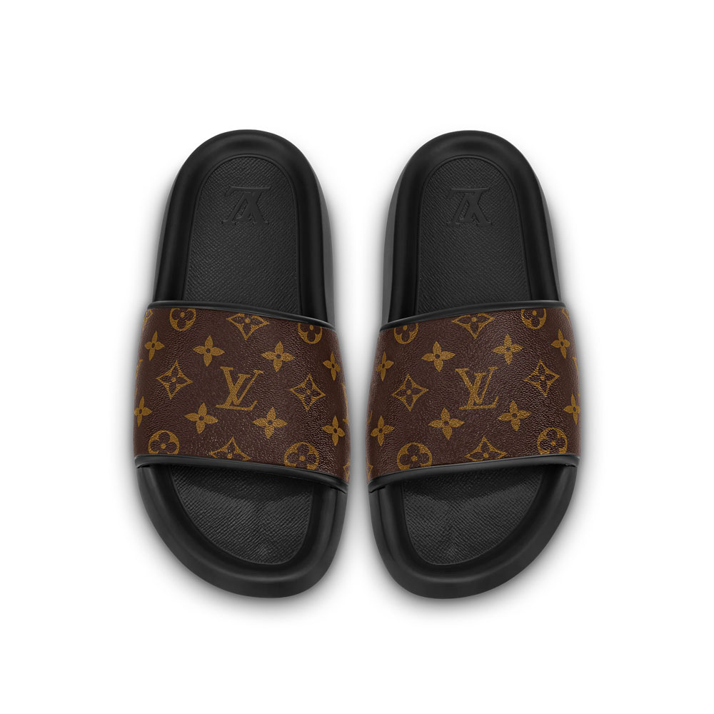 The Waterfront mule is revisited this season in Monogram rubber. which replicates the look of Monogram canvas. One of Louis Vuitton's emblematic styles. this fully waterproof pool slide has a comfortable anatomic insole and a lightweight. flexible rubber outsole. which is debossed with the House signature.