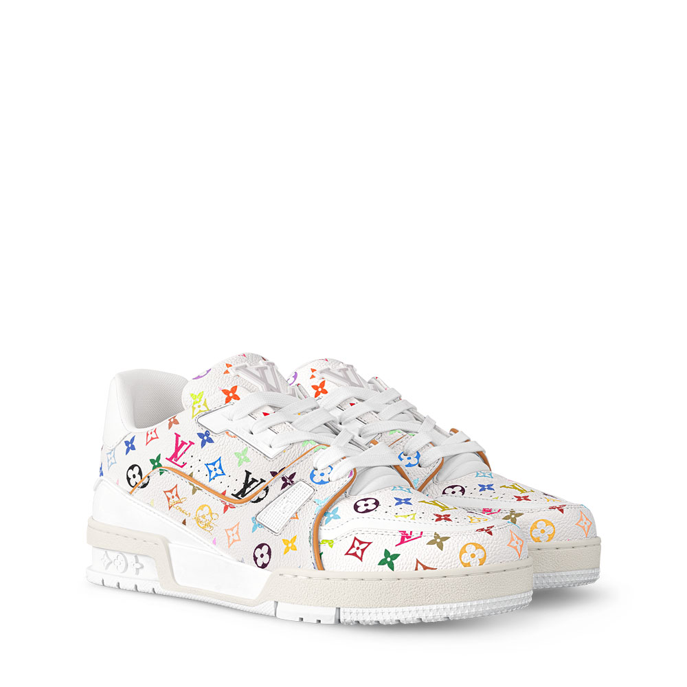 Introducing the revamped LV Trainer sneaker from Louis Vuitton's collaboration with TM. This eye-catching design showcases grained calf leather decorated with Murakami's vibrant multicolor Monogram pattern - a bold reinterpretation of the classic LV x Murakami collection.