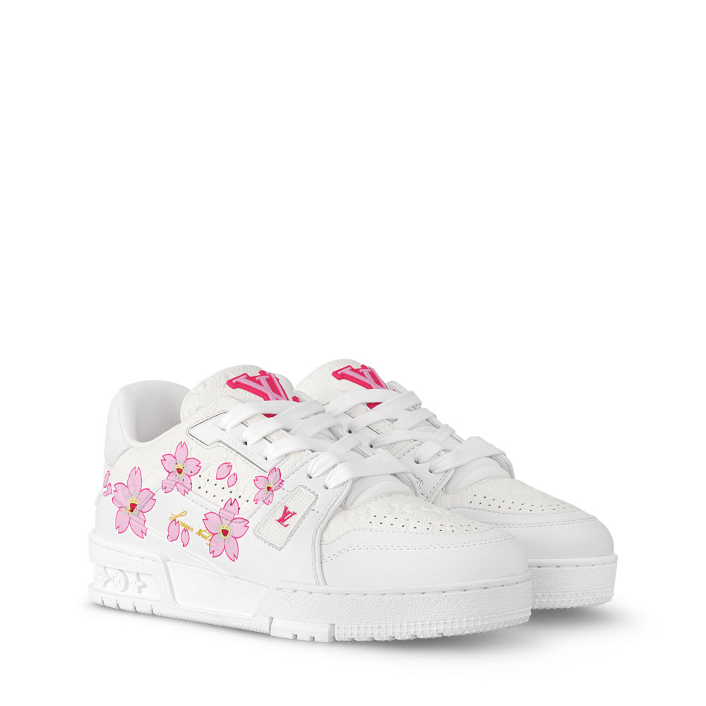 Introducing the reinvented LV Trainer sneaker from the Louis Vuitton x Takashi Murakami collaboration. This stylish re-edition transforms the classic design into a playful masterpiece featuring Takashi Murakami's signature Cherry Blossom prints.