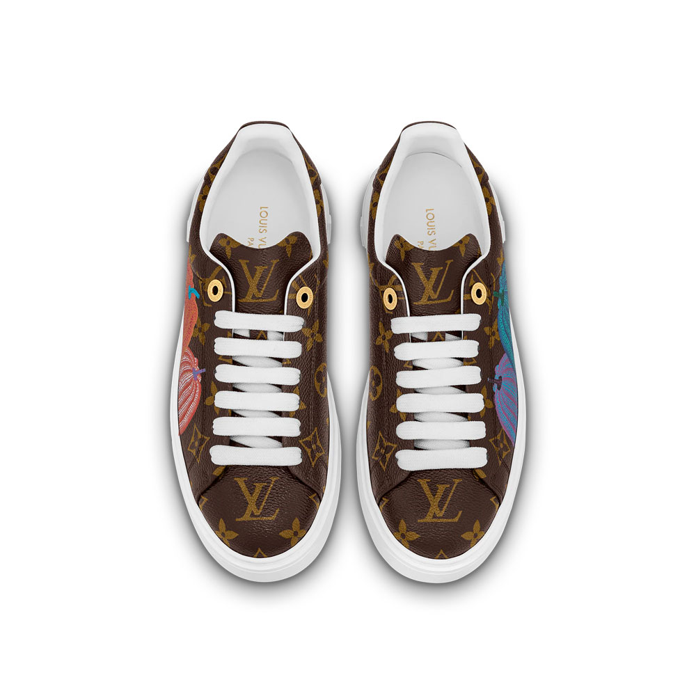 The LV x YK Time Out sneaker is part of the Louis Vuitton x Yayoi Kusama collection. the second major collaboration between the House and the Japanese artist. It brings together two iconic signatures: Monogram canvas and Pumpkins. which are a recurring theme of the artist's work. This emblematic style is notable for its engraved. gold-tone eyelets and elevated rubber outsole.