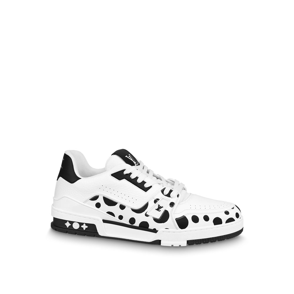 The LV x YK LV Trainer sneaker is a special edition belonging to the Louis Vuitton x Yayoi Kusama collection. Crafted from calf leather. it is printed with the Infinity Dots motif for which the avant-garde Japanese artist is renowned. The signature of the collaboration is embossed at the back of the sneaker. Designed by Virgil Abloh. this model is an icon of the Louis Vuitton shoe collection.