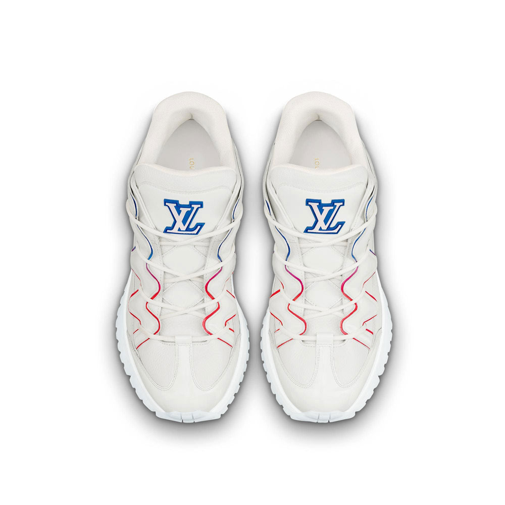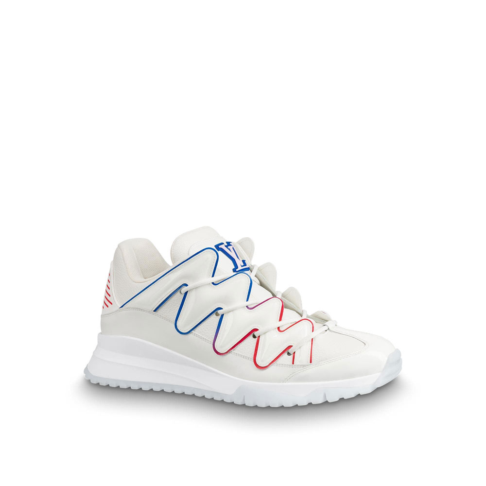 The Zig Zag sneaker contrasts the simplicity of white calf leather with an avant-garde chunky design. The distinctive zigzag patterns on its upper are highlighted by a thin line which shades from blue to red. This model features an LV Initials label on the tongue.
